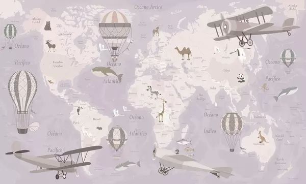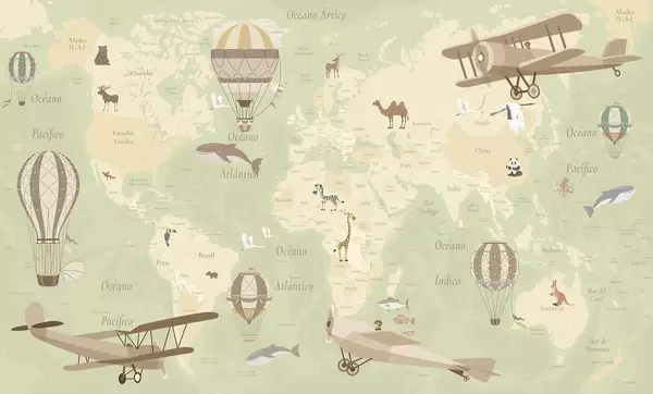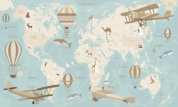 Fotobehang Wereldkaart voor kinderen met dieren, vliegtuigen en heteluchtballonnen. Spaanse taal. Beige kleur. N° c00003es