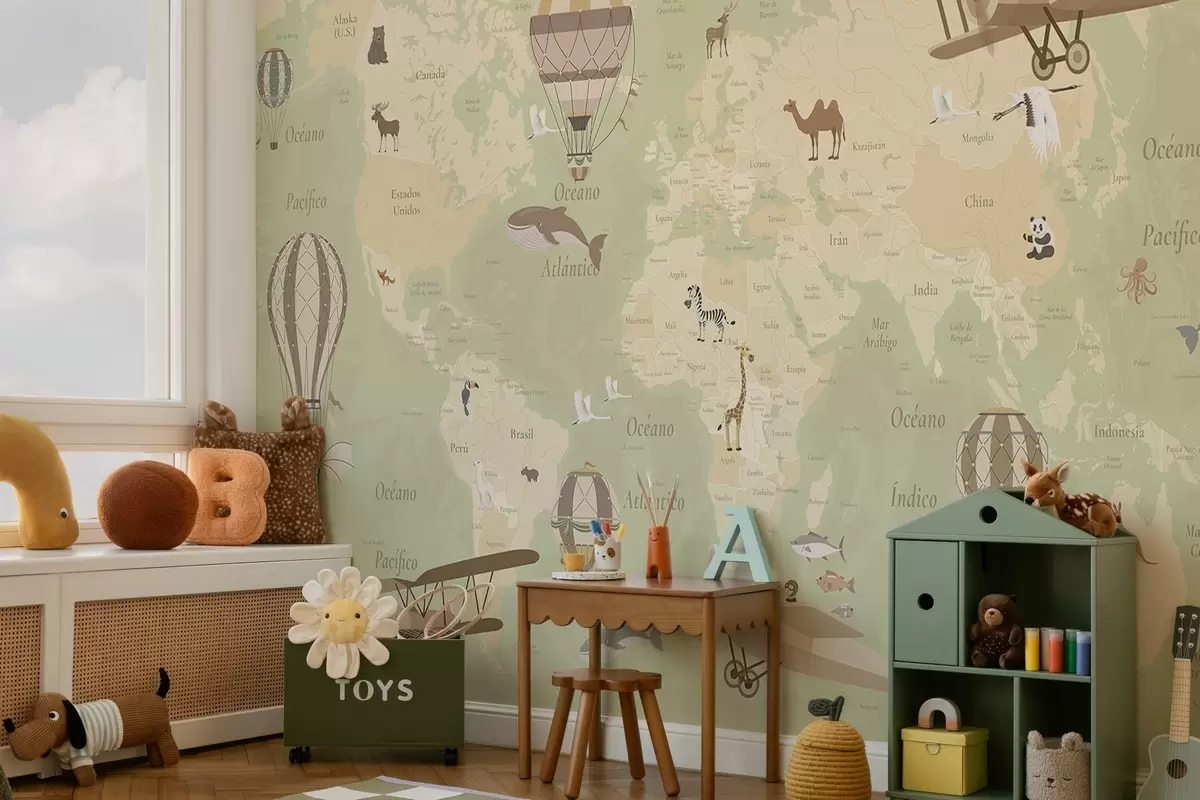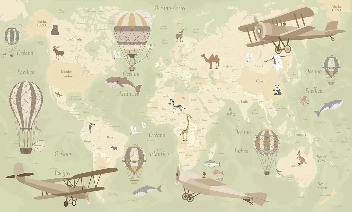 Fotobehang Wereldkaart voor kinderen met dieren, vliegtuigen en heteluchtballonnen. Spaanse taal. Groene kleur. N° c00003esv2