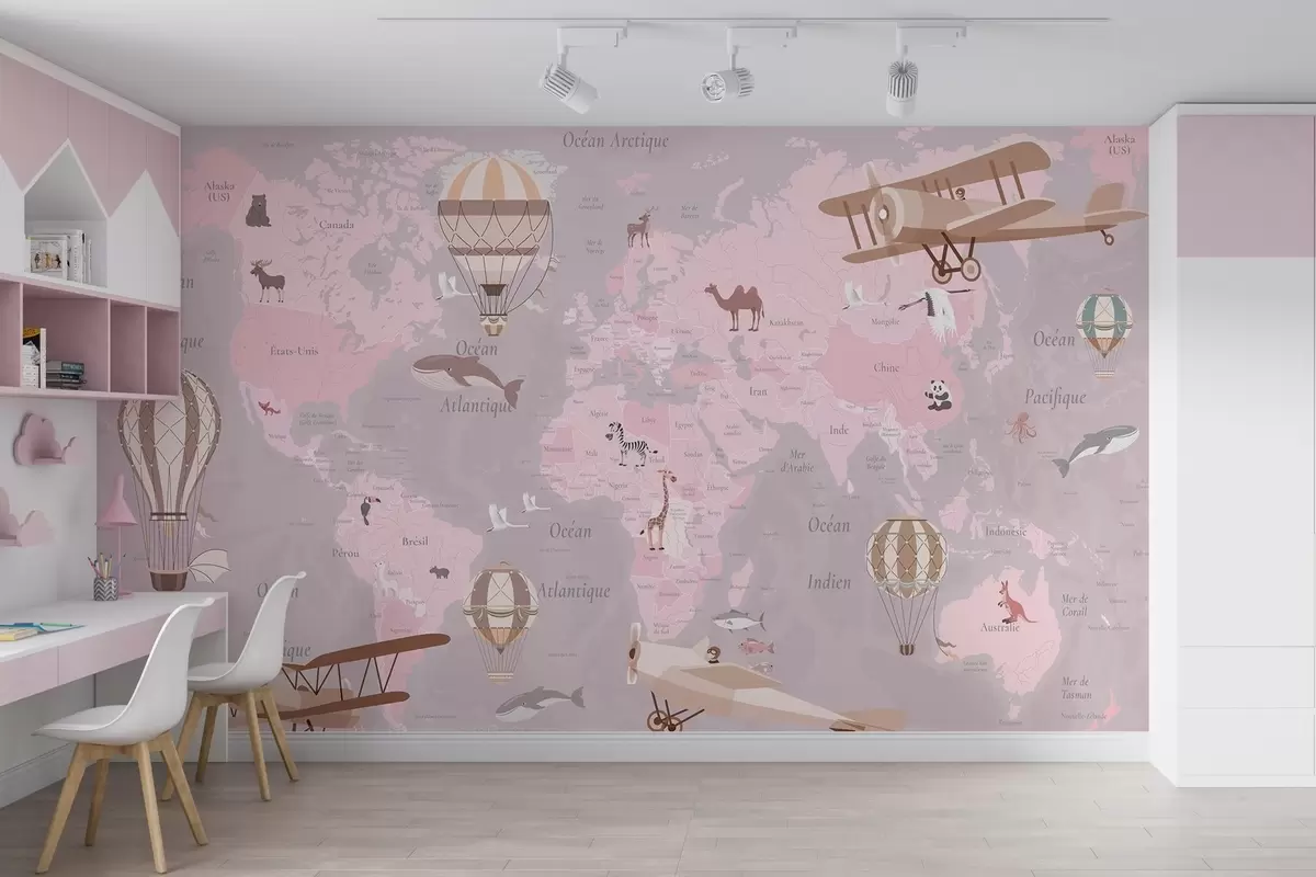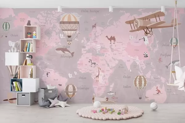 Fotobehang Wereldkaart voor kinderen met dieren, vliegtuigen en heteluchtballonnen. Franse taal. Roze kleur. N° c00003frv3
