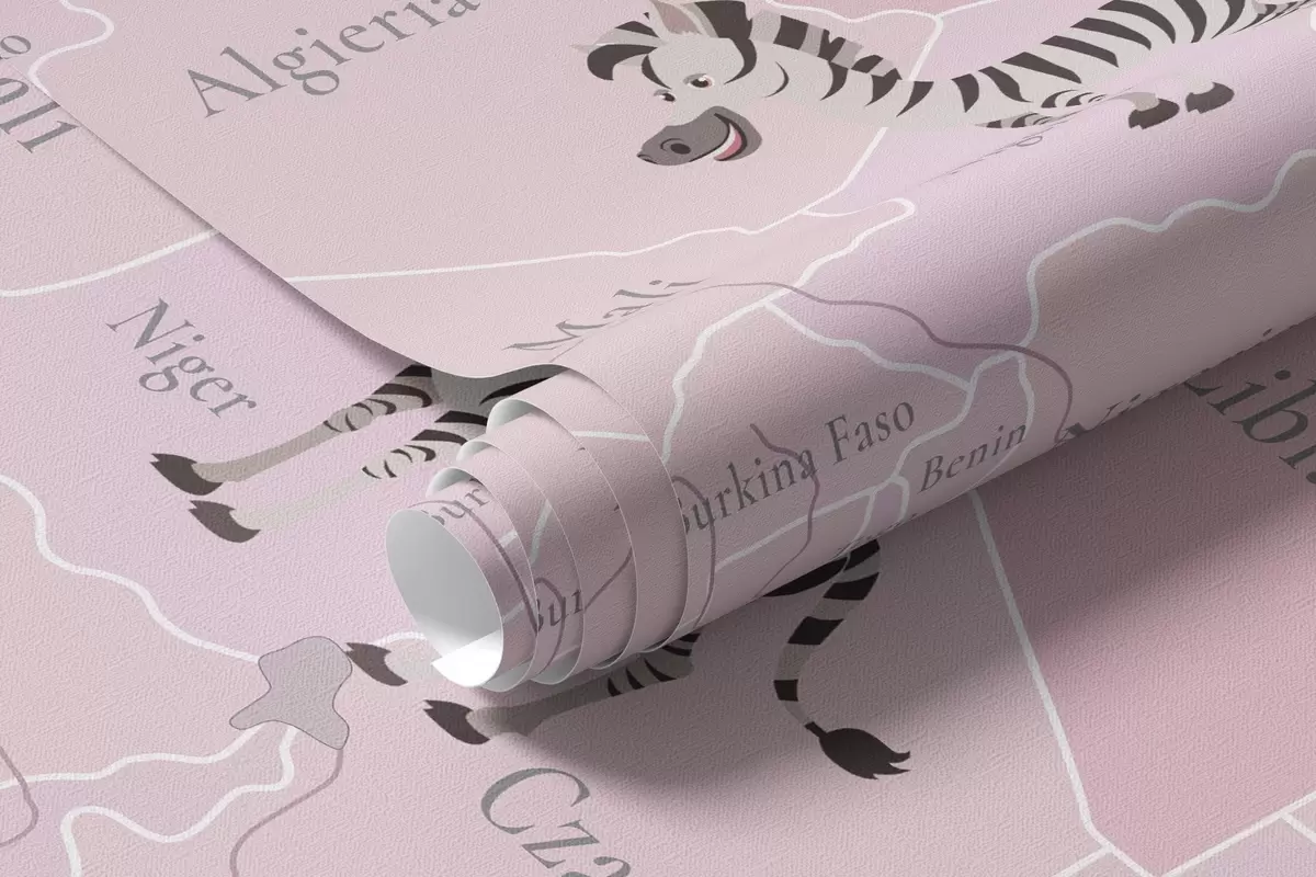 Fotobehang Wereldkaart voor kinderen met dieren, vliegtuigen en heteluchtballonnen. Poolse taal. Roze kleur. N° c00003plv3