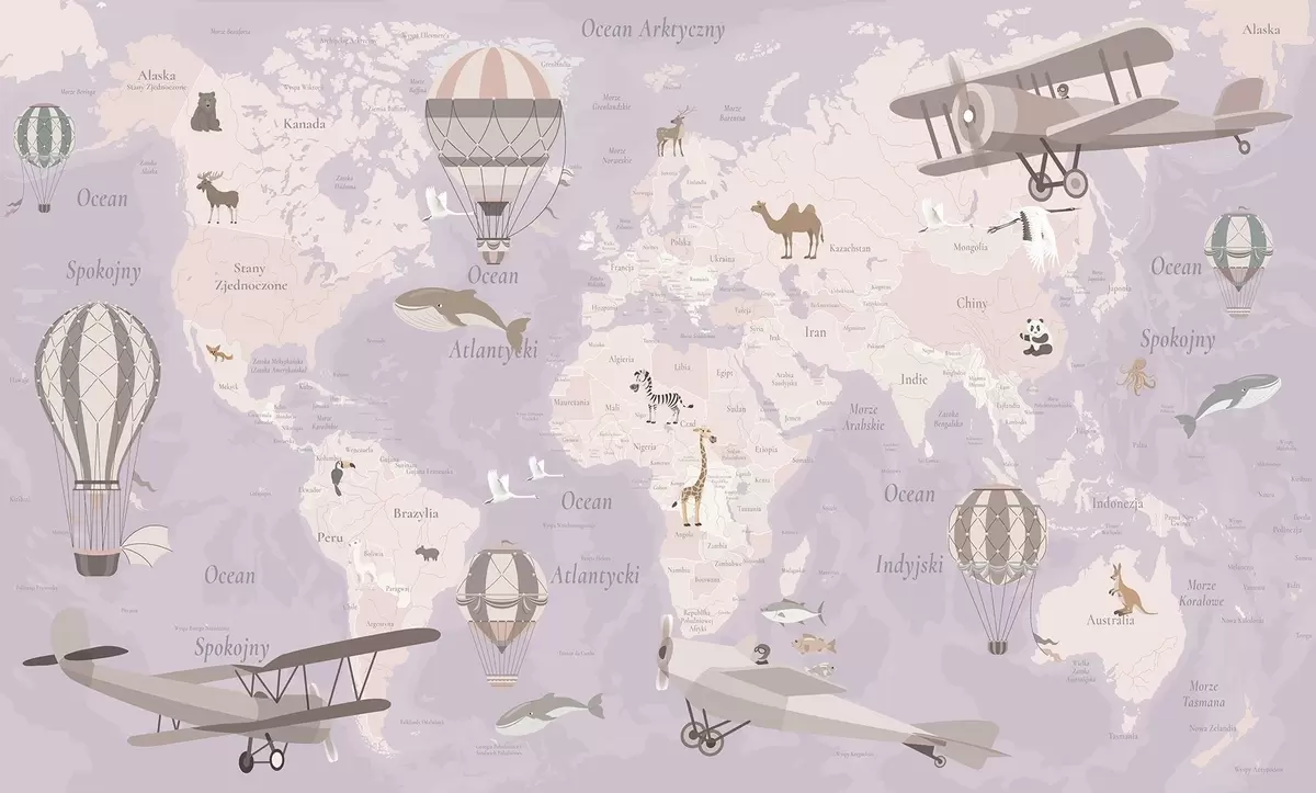 Fotobehang Wereldkaart voor kinderen met dieren, vliegtuigen en heteluchtballonnen. Poolse taal. Paarse kleur. N° c00003plv4