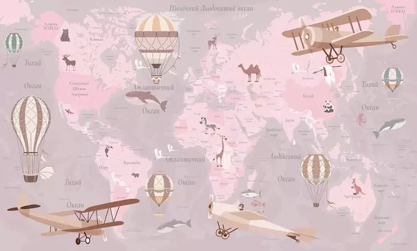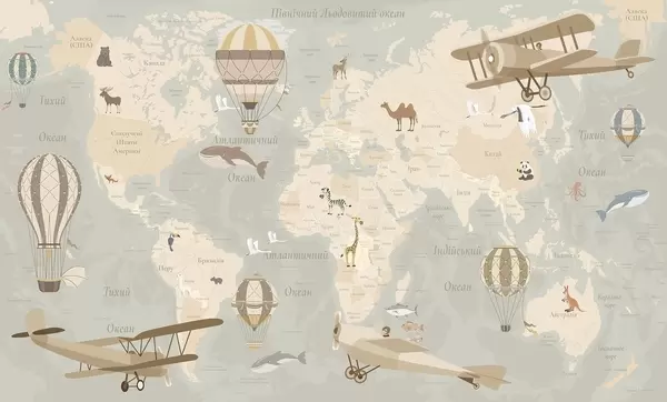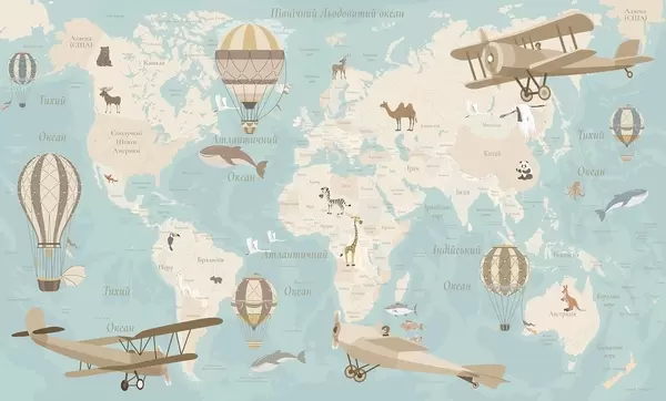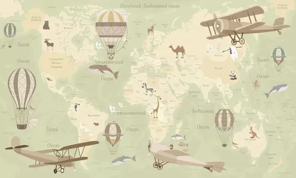 Fotobehang Wereldkaart voor kinderen met dieren, vliegtuigen en heteluchtballonnen. Oekraïense taal. Beige kleur. N° c00003uk
