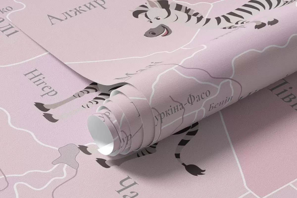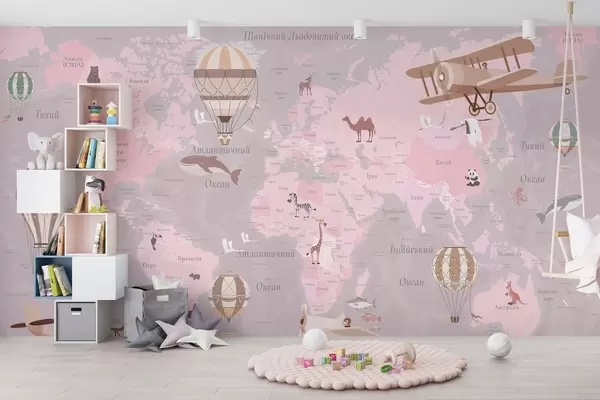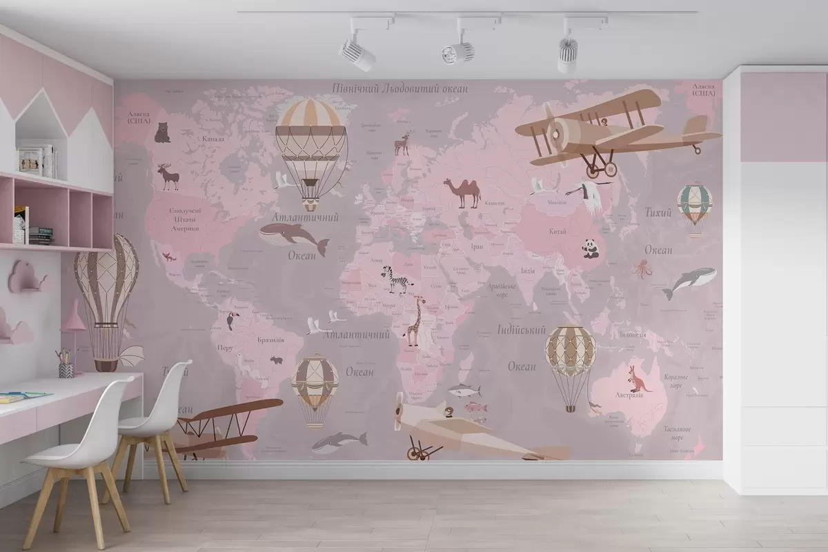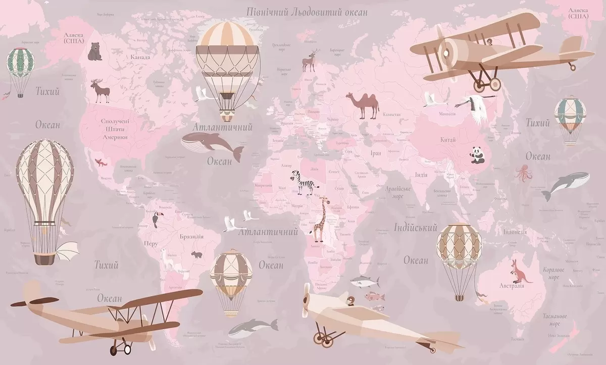 Fotobehang Wereldkaart voor kinderen met dieren, vliegtuigen en heteluchtballonnen. Oekraïense taal. Roze kleur. N° c00003ukv3
