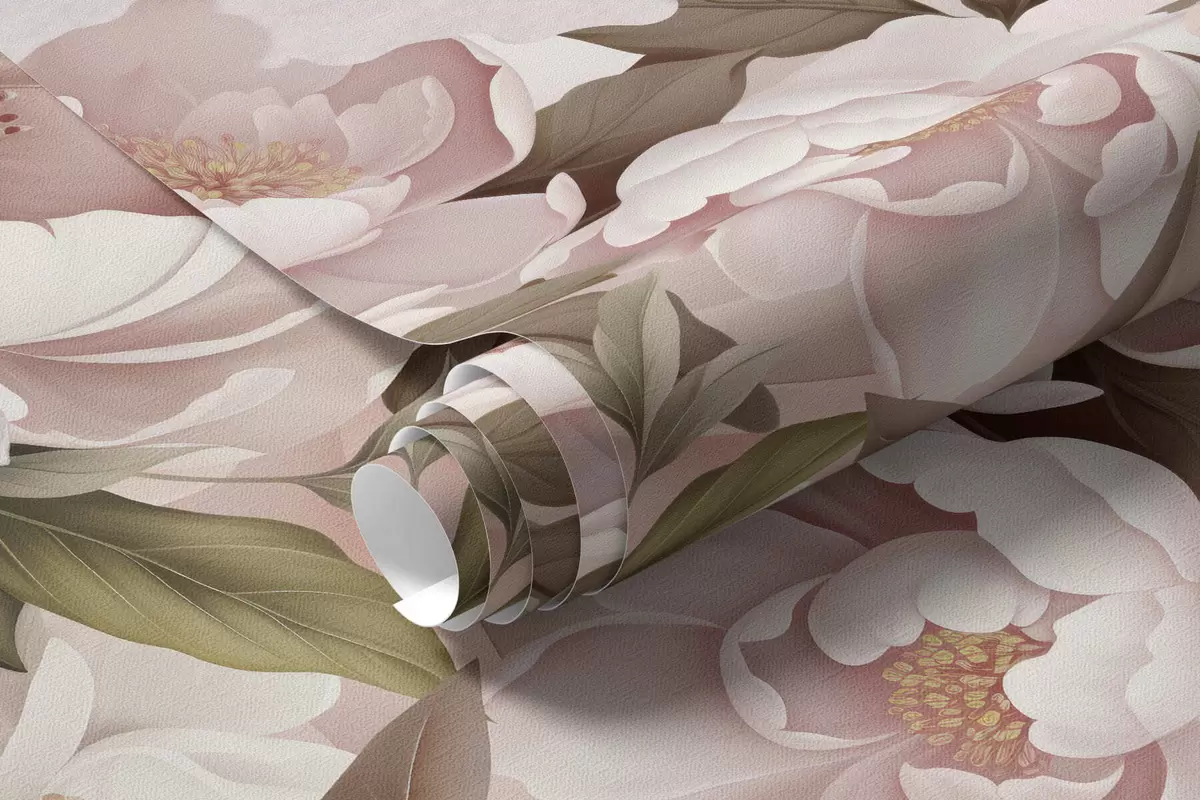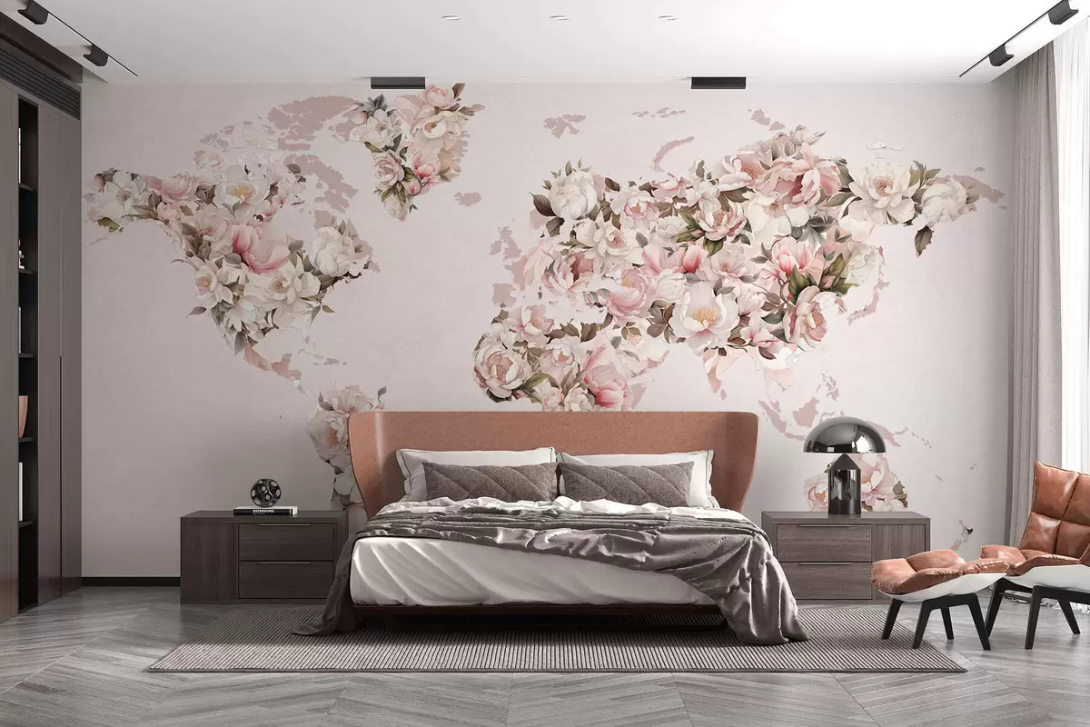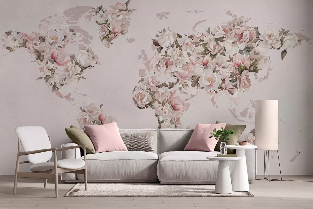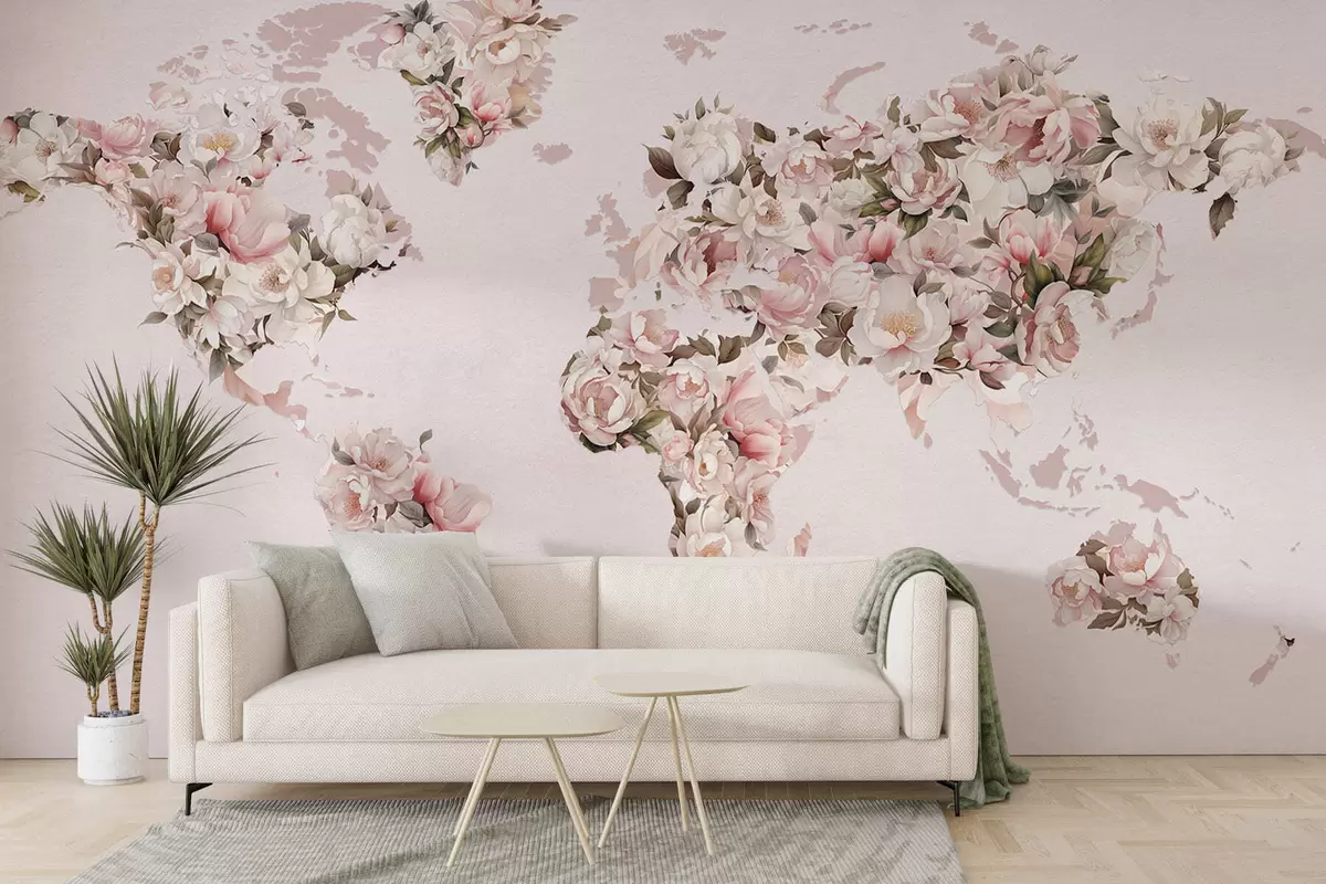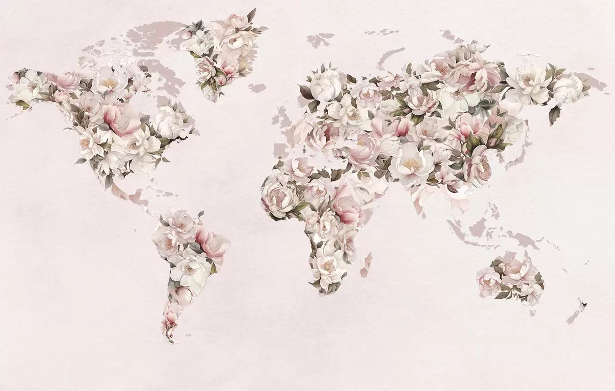 Fotobehang Een roze wereldkaart gemaakt van grote witte en roze pioenrozen N° c00005