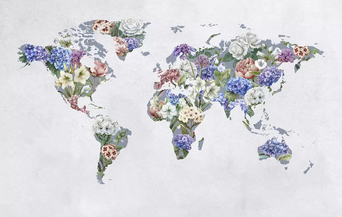 Fotobehang Een kleurrijke wereldkaart gemaakt van allerlei levendige bloemen N° c00006