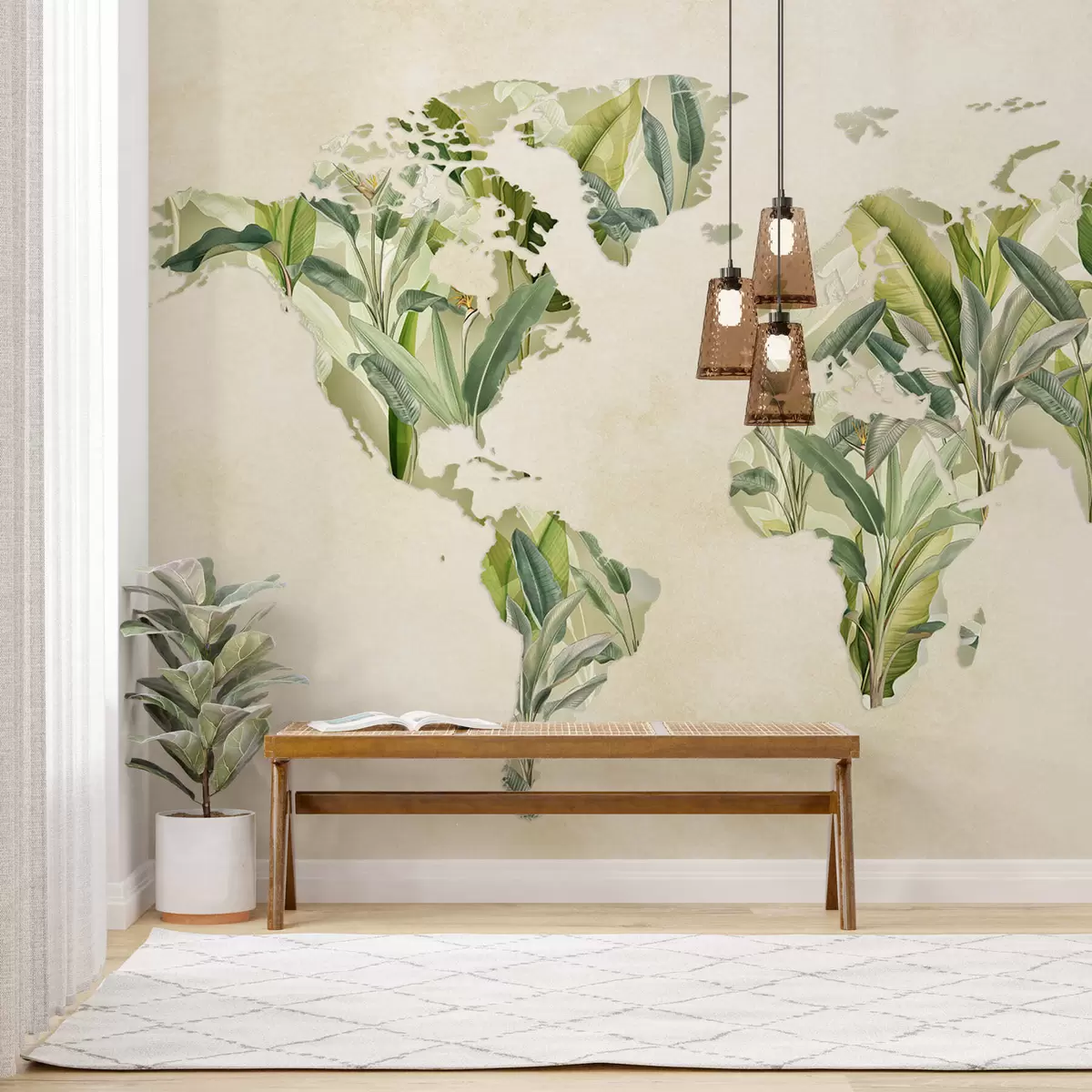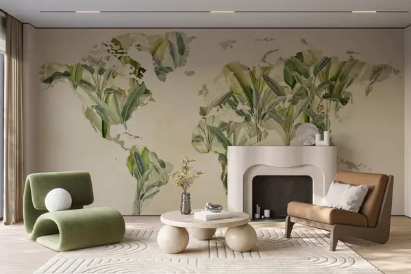 Fotobehang Een groene wereldkaart gemaakt van bananenbladeren N° c00007