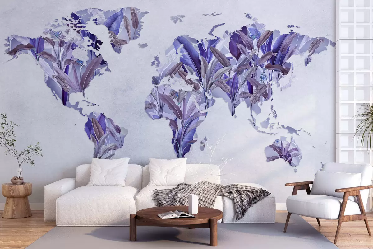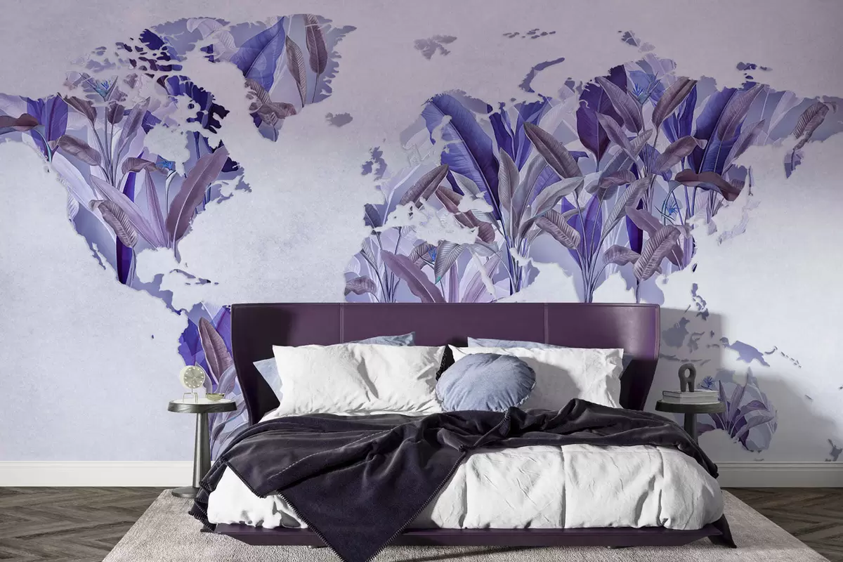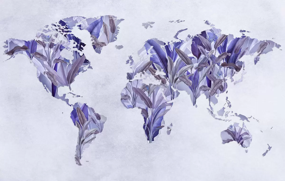 Fotobehang Een paarse wereldkaart gemaakt van bananenbladeren N° c00007v1