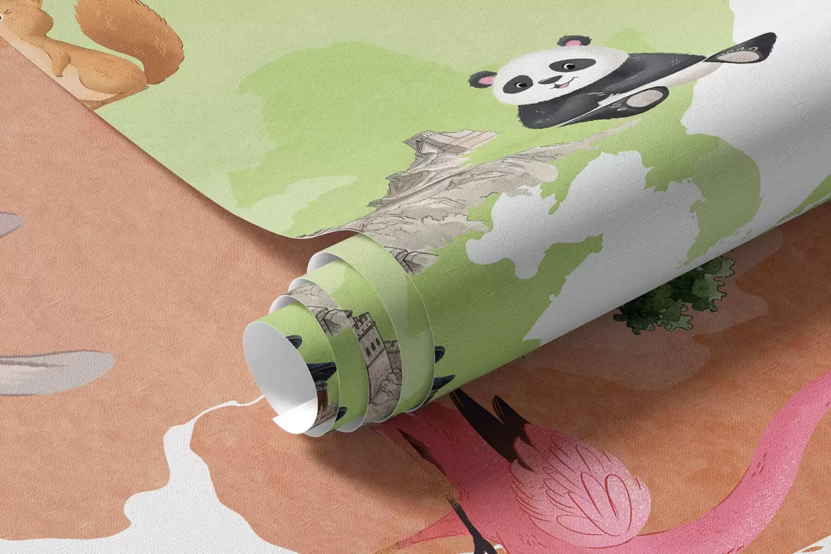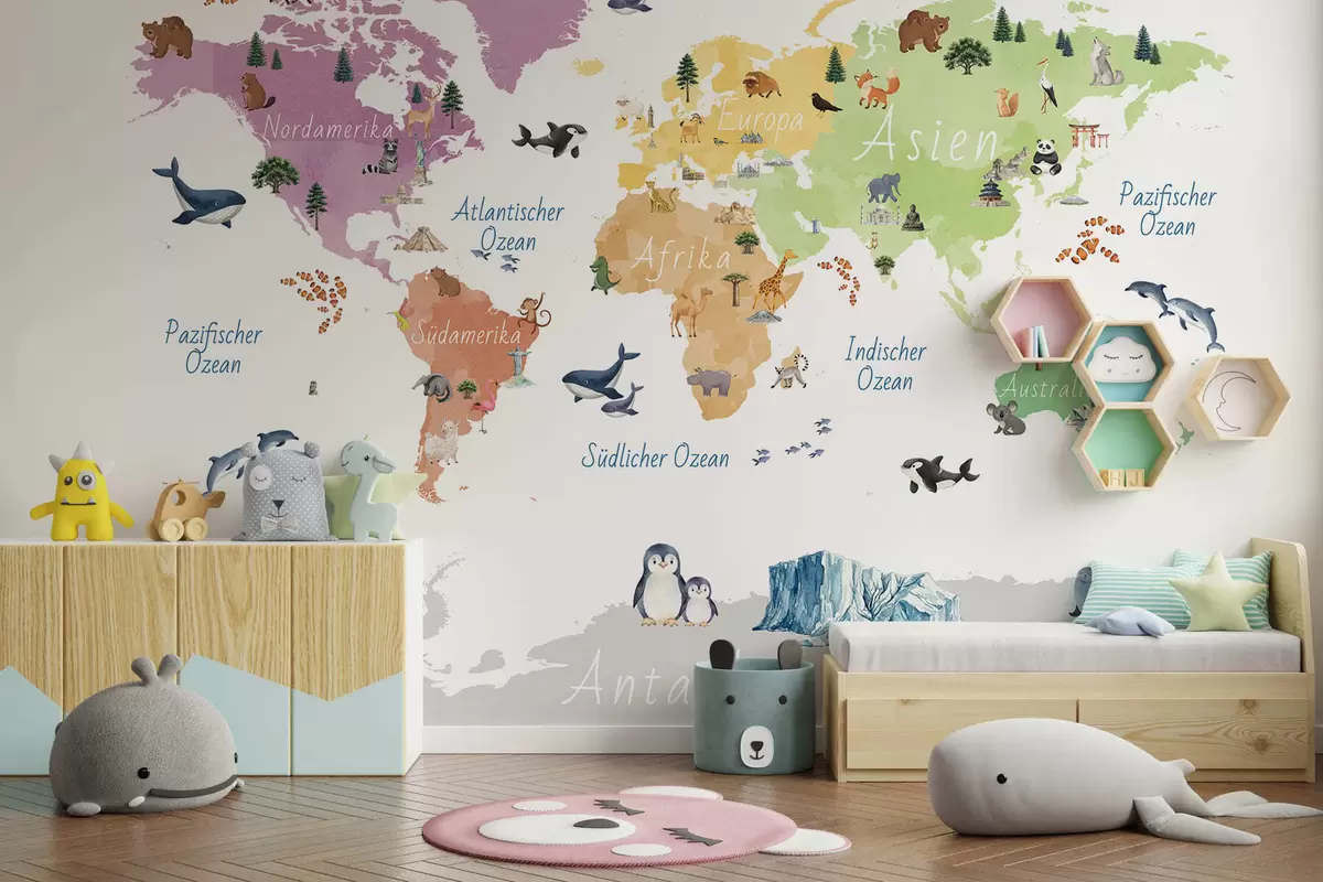 Fotobehang Een kleurenkaart in aquarelstijl met afbeeldingen van dieren, planten en architectuur. Bijschriften in het Duits N° c00009de