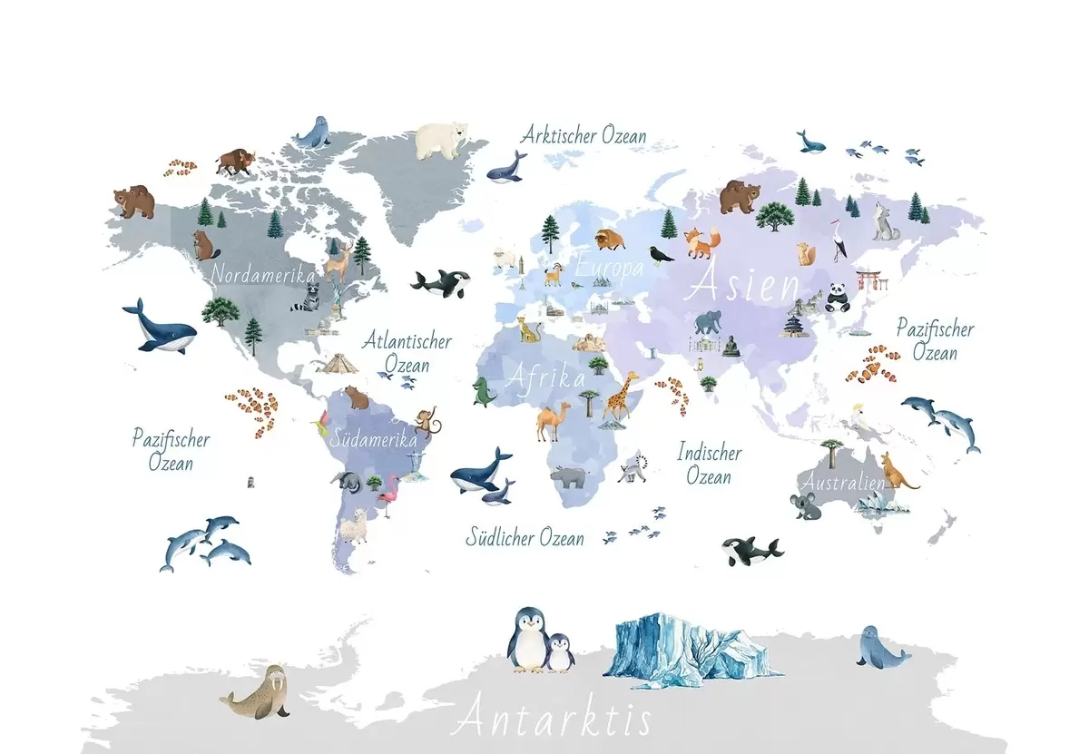 Fotobehang Een blauwe kaart in aquarelstijl met afbeeldingen van dieren, planten en gebouwen. Bijschriften in het Duits N° c00009dev1