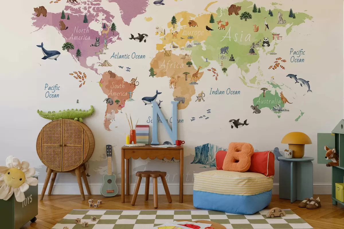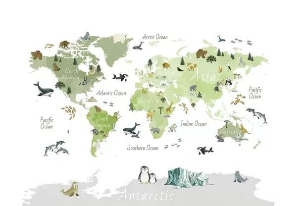 Fotobehang Een kleurenkaart in aquarelstijl met afbeeldingen van dieren, planten en architectuur. Bijschriften in het Engels N° c00009en