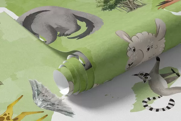 Fotobehang Een groene kaart in aquarelstijl met dieren, planten en architectuur. Bijschriften in het Engels N° c00009env2
