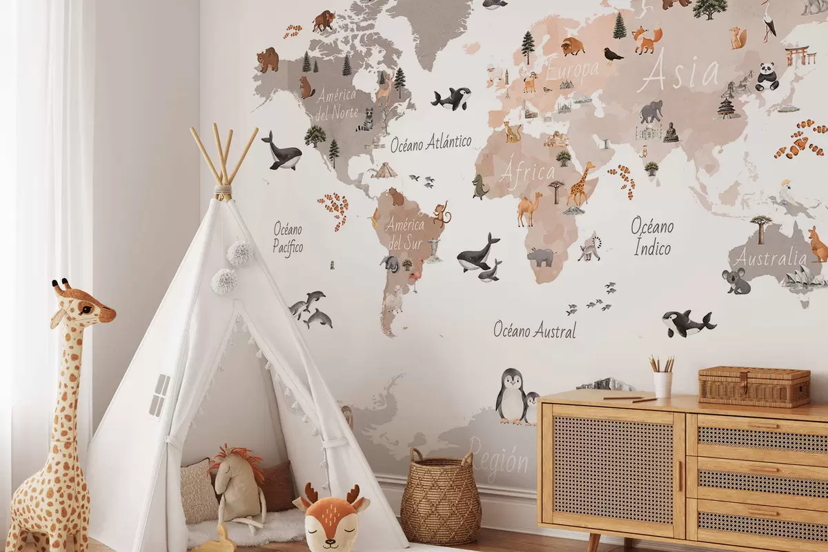 Fotobehang Een beige kaart in aquarelstijl met afbeeldingen van dieren, planten en gebouwen. Bijschriften in het Spaans N° c00009esv3