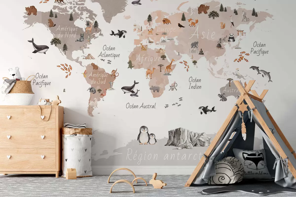 Fotobehang Een beige kaart in aquarelstijl met afbeeldingen van dieren, planten en architectuur. Bijschriften in het Frans N° c00009frv3