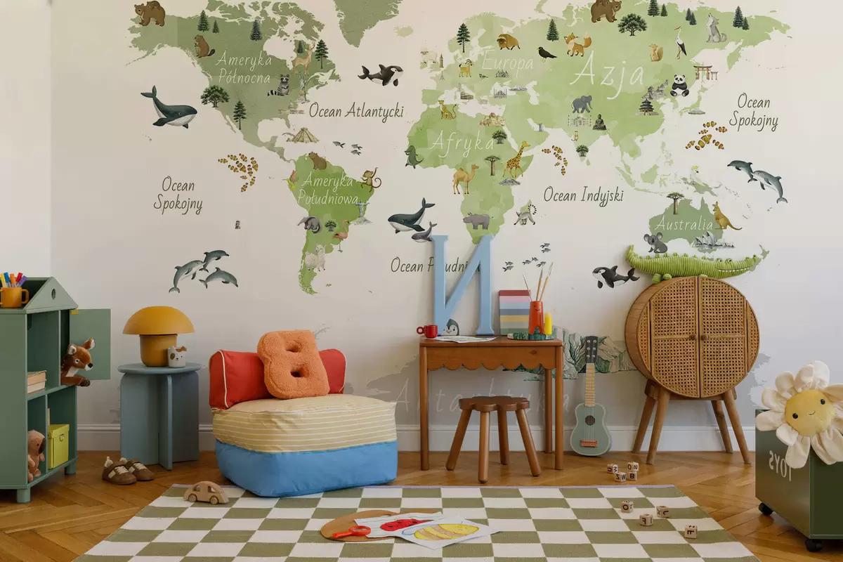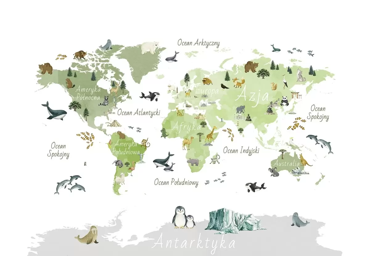 Fotobehang Een groene kaart in aquarelstijl met dieren, planten en architectuur. Bijschriften in het Pools N° c00009plv2