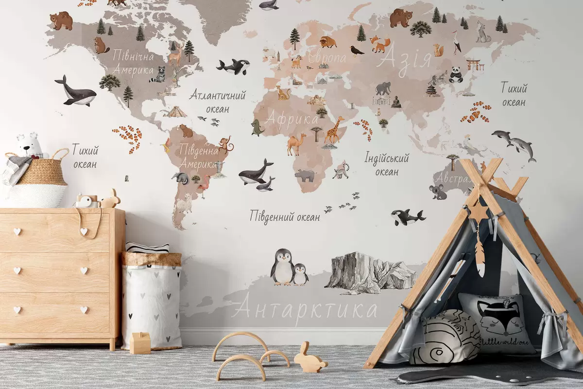 Fotobehang Een beige kaart in aquarelstijl met afbeeldingen van dieren, planten en gebouwen. Bijschriften in het Oekraïens N° c00009ukv3