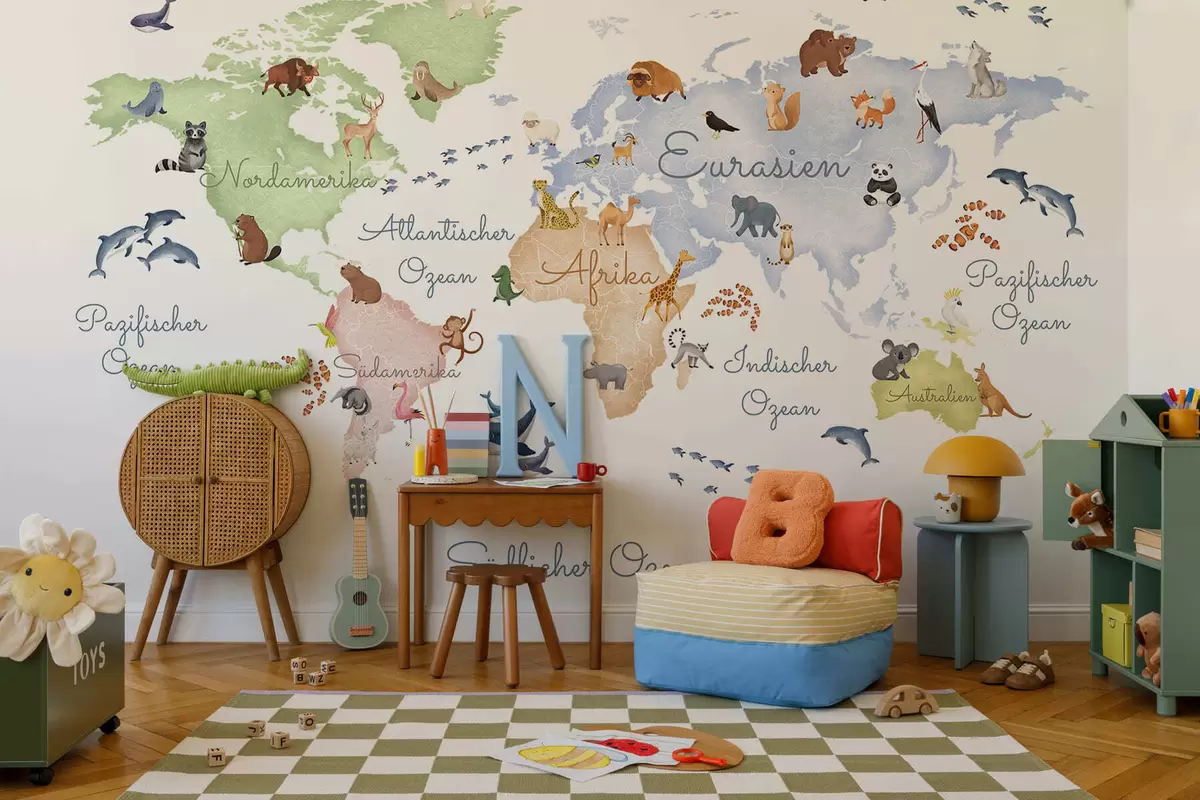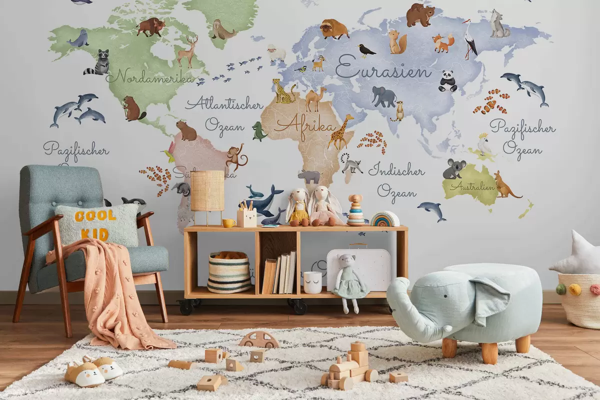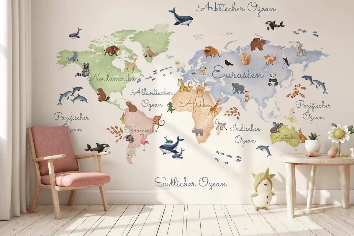 Fotobehang Een witte kaart in aquarelstijl met dieren. Opschriften in het Duits N° c00012de