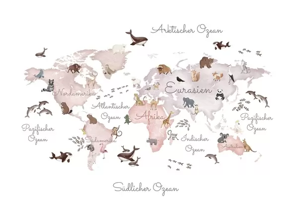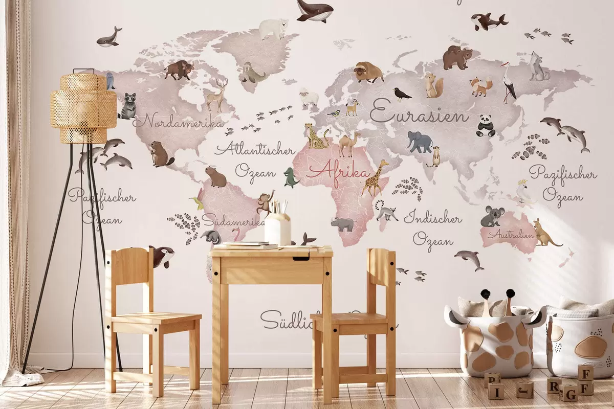 Fotobehang Een beige kaart in aquarelstijl met dieren. Opschriften in het Duits N° c00012dev3