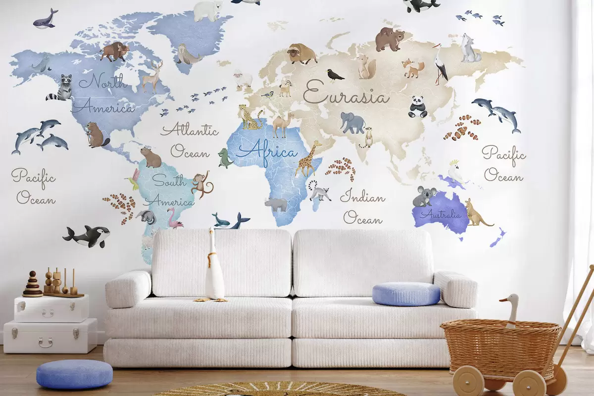 Fotobehang Een blauwe kaart in aquarelstijl met dieren. Teksten in het Engels N° c00012env1