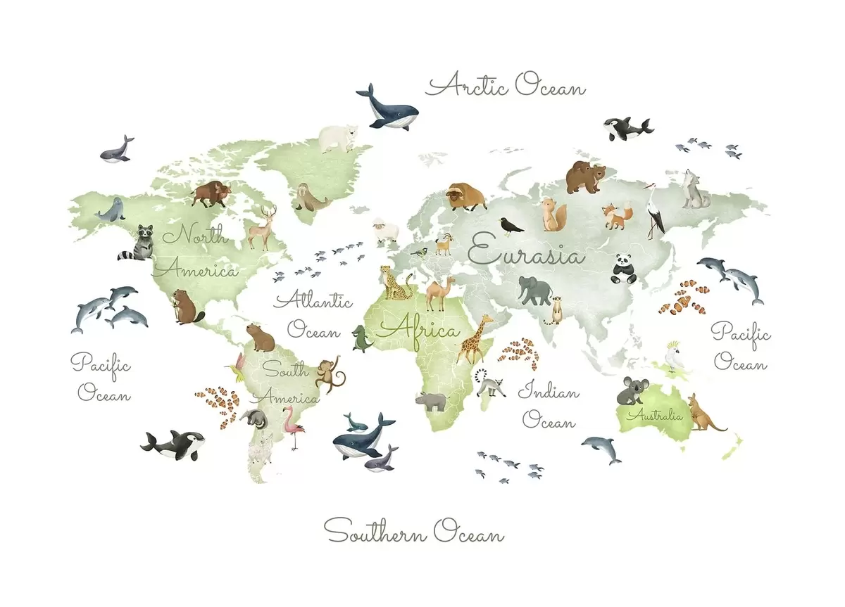 Fotobehang Een groene kaart in aquarelstijl met dieren. Teksten in het Engels N° c00012env2