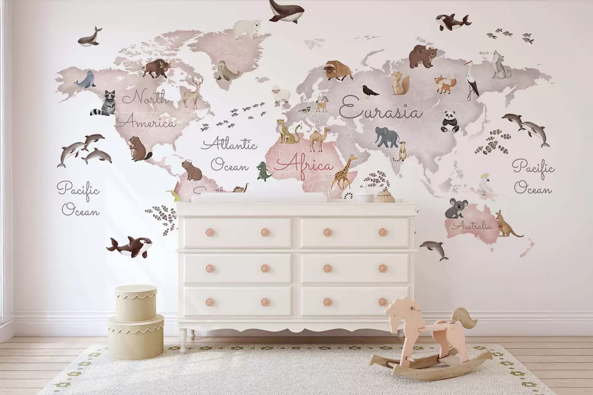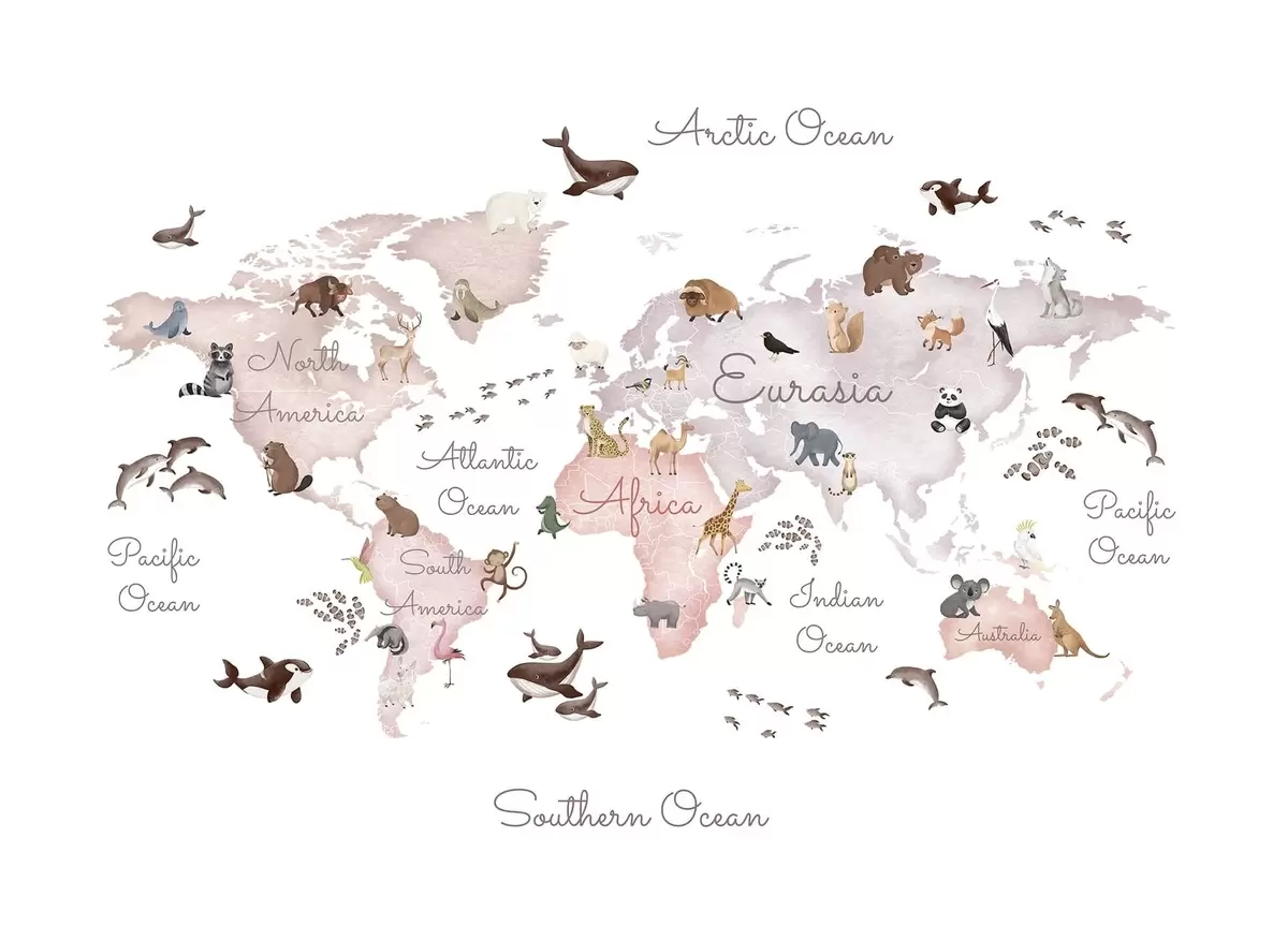 Fotobehang Een beige kaart in aquarelstijl met dieren. Teksten in het Engels N° c00012env3