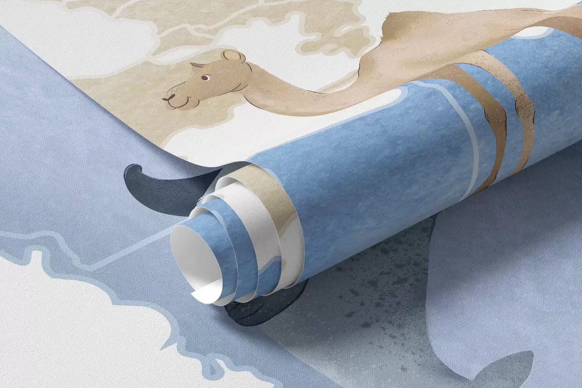 Fotobehang Een blauwe kaart in aquarelstijl met dieren. Opschriften in het Pools N° c00012plv1