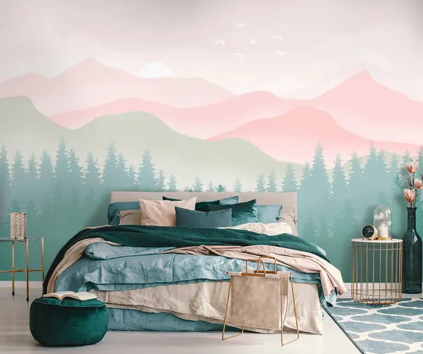 Fotobehang Mistige bergen met dennenbos, zachte natuurlijke kleuren, roze en groen N° u98774