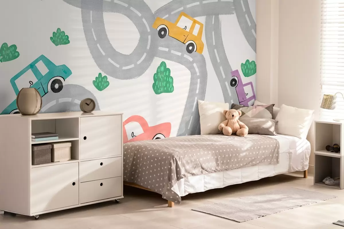 Fotobehang Kleurrijke auto's op een kronkelige weg N° w00599