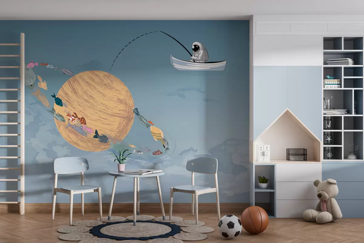 Fotobehang Astronautenmaan en vissen in blauw N° w00869v1