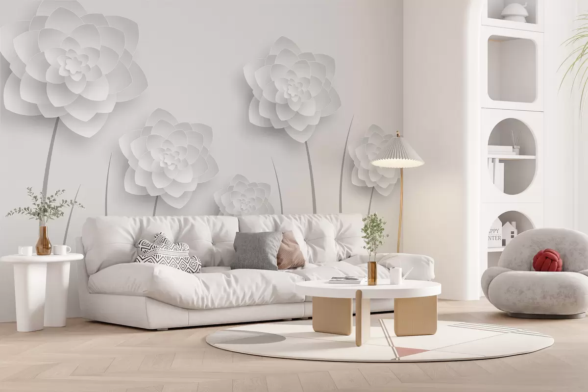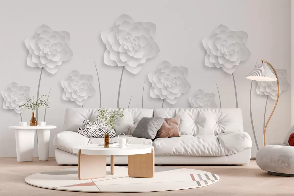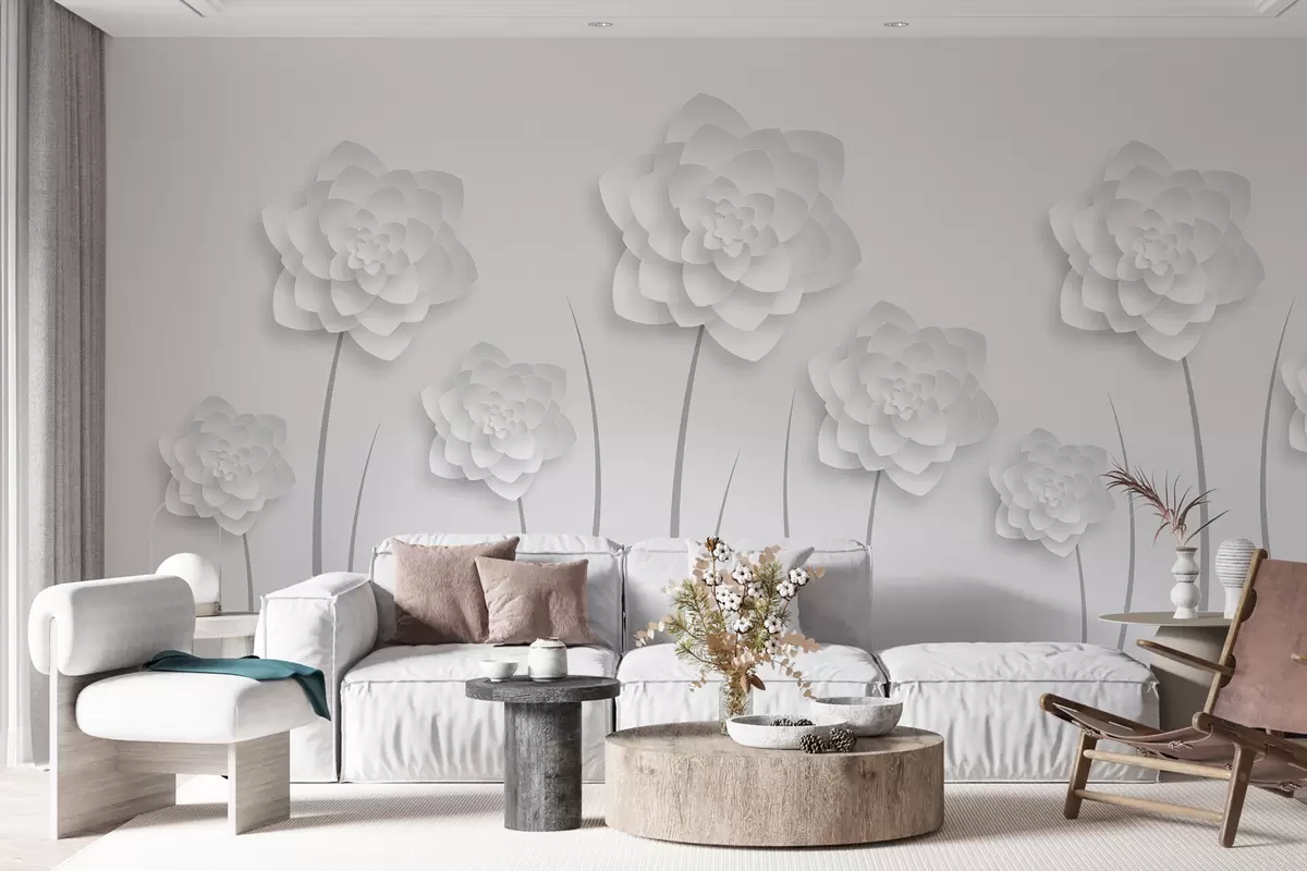 Fotobehang Grote bloemen met imitatie van volume in papierstijl op een lichtgrijze achtergrond met een grijze steel N° w01021
