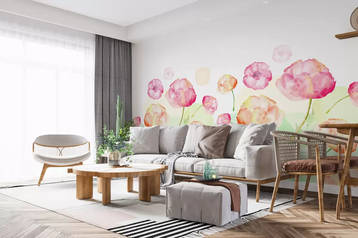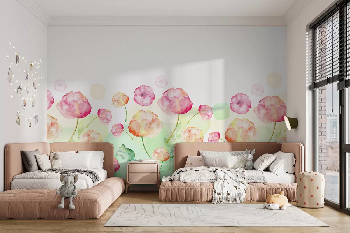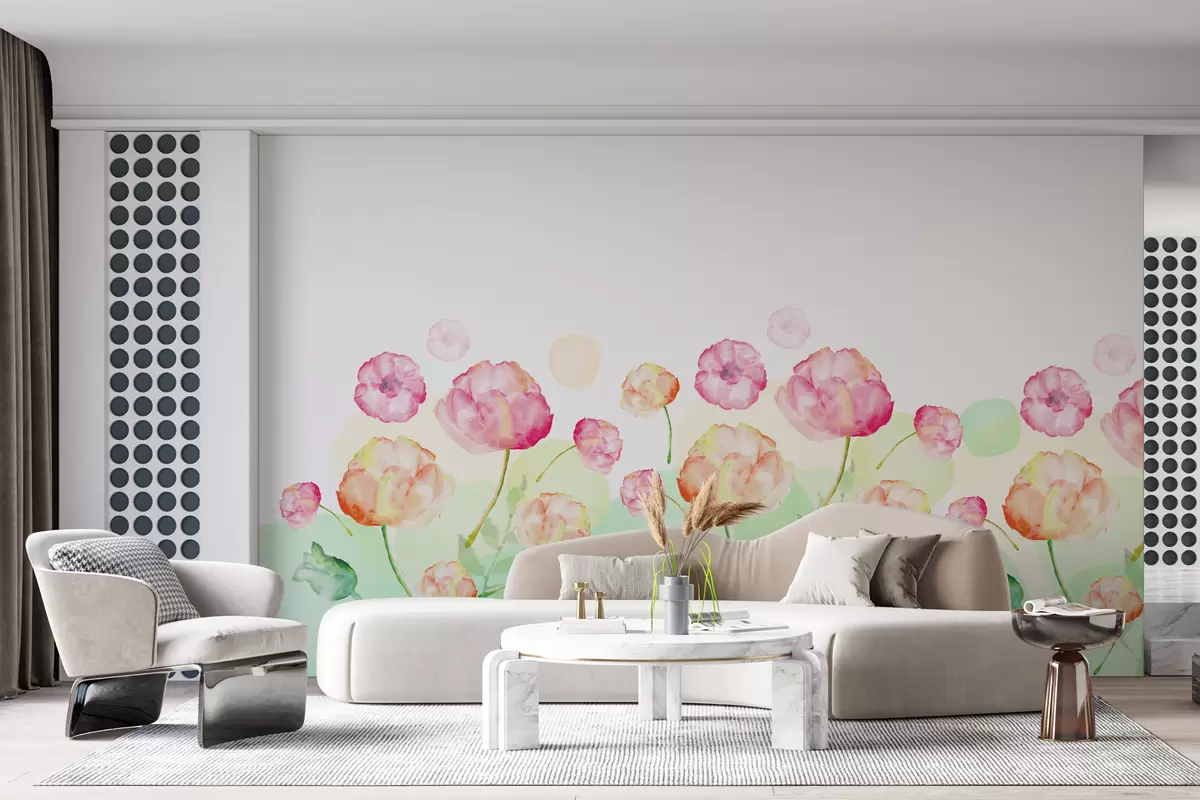 Fotobehang rood-oranje en roze tulpen in aquareltechniek op een witte achtergrond met groene vlekken N° w01028
