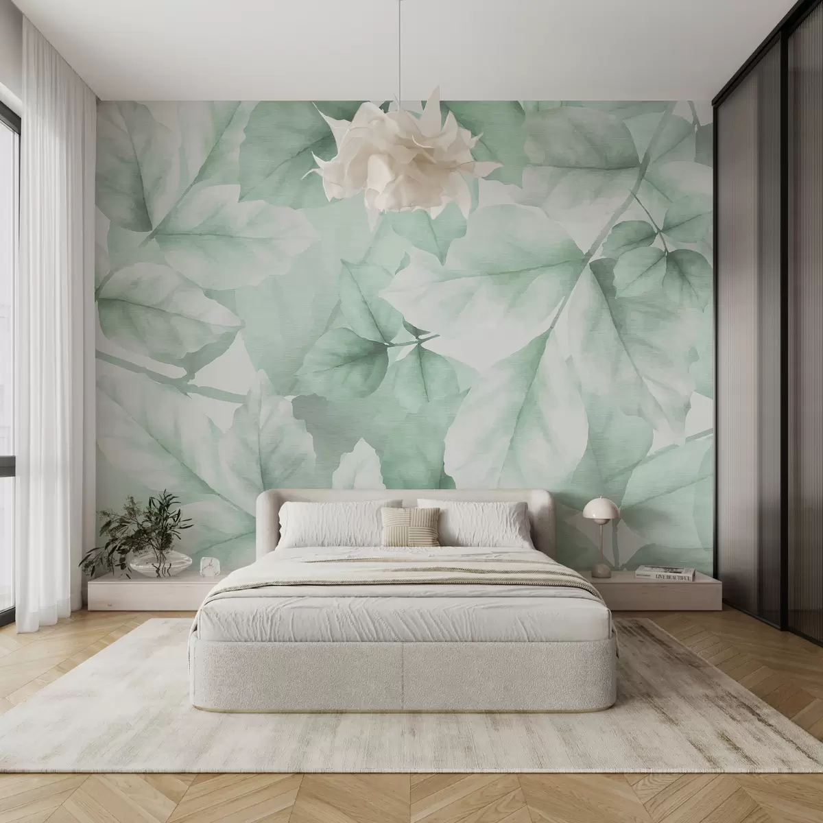 Fotobehang Behang met structuur en grote bladeren in pasteltinten groen N° w01090v3