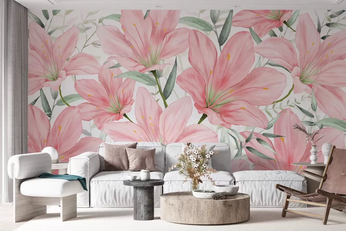 Fotobehang Grote lichtroze lelies en bladeren in aquarelstijl op een witte achtergrond N° w01121