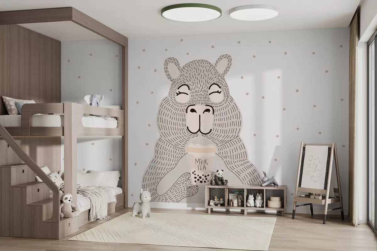 Fotobehang Grote schattige beige capibara met bubble tee in een minimalistische streepjesstijl op een witte gestippelde achtergrond N° w01122