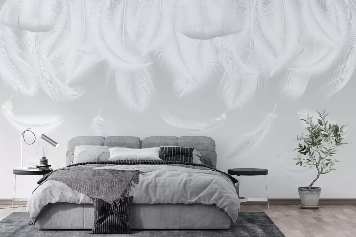 Fotobehang Delicate witte veren die van boven vallen op een warme grijze achtergrond N° w01150