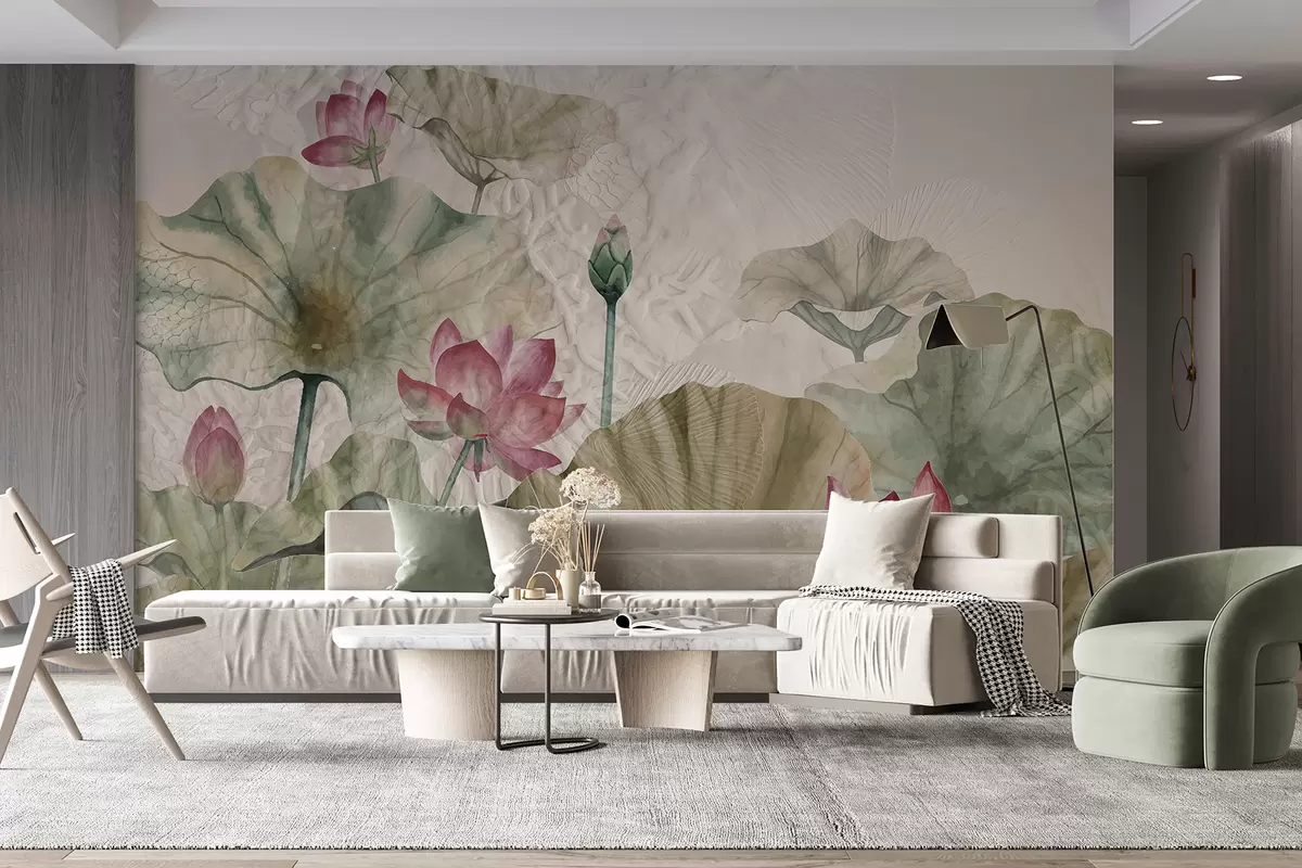 Fotobehang Roze lotusbloemen met groene bladeren tegen een licht gestructureerde achtergrond N° w01248