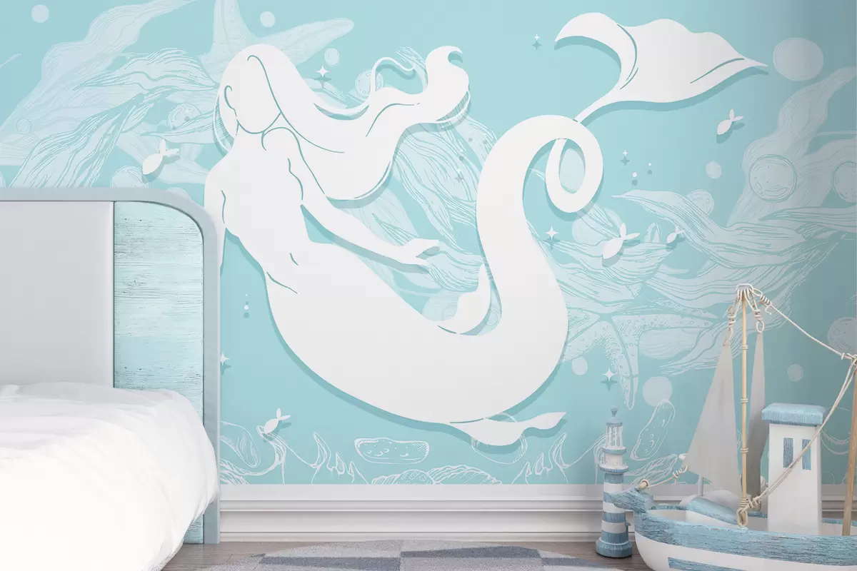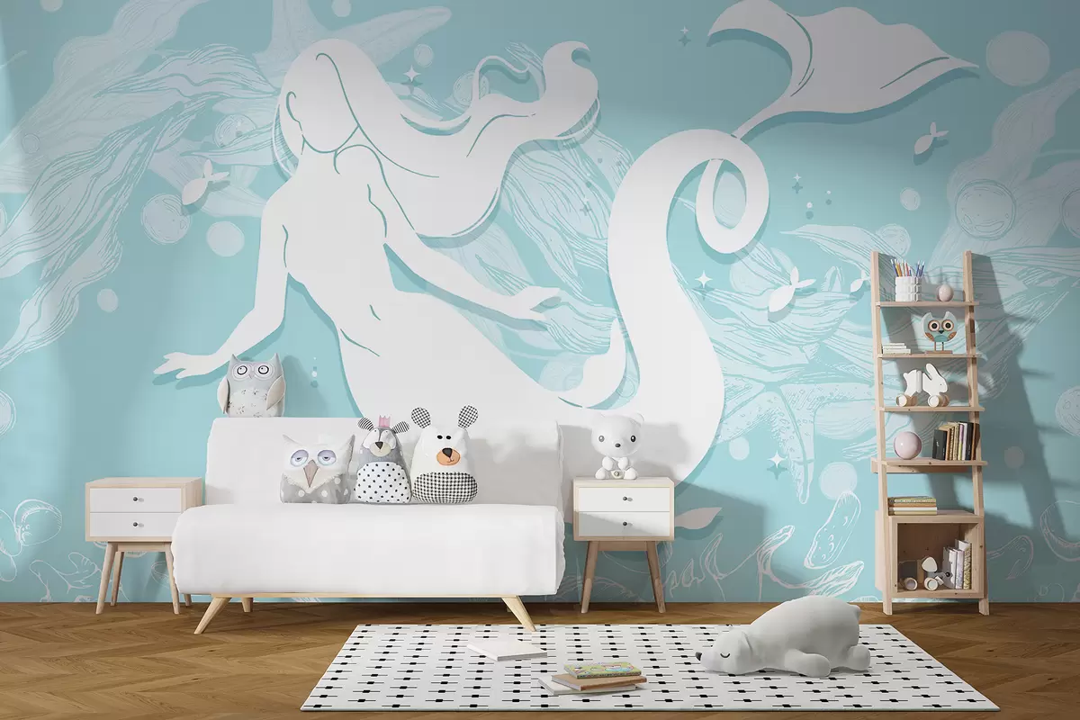 Fotobehang Een witte zeemeermin met lang golvend haar, zwemmend in een lichtblauwe oceaan met witte golven en bubbels N° w01316