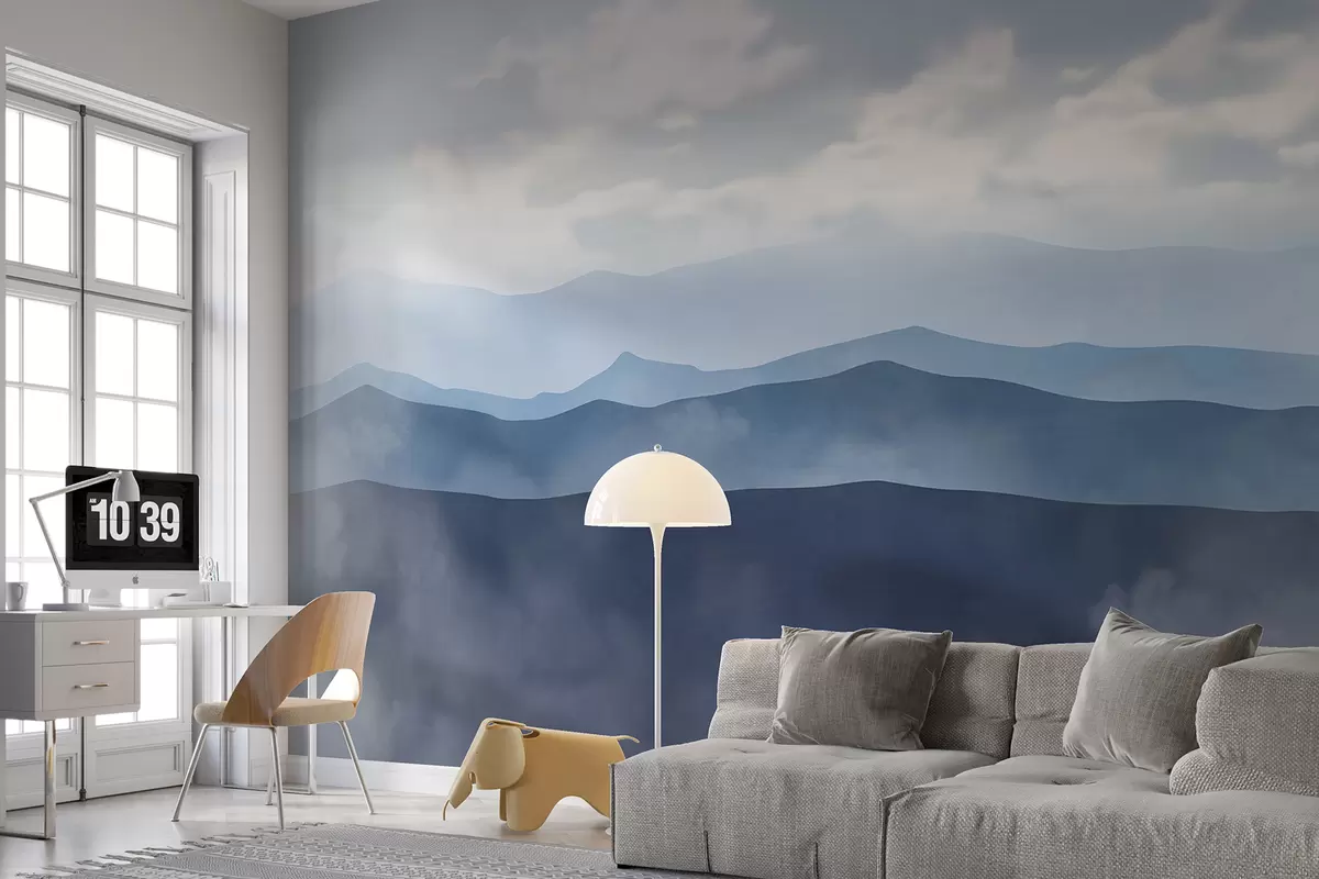 Fotobehang Mistig minimalisme berglandschap met glooiende heuvels en bewolkte hemel N° w01317