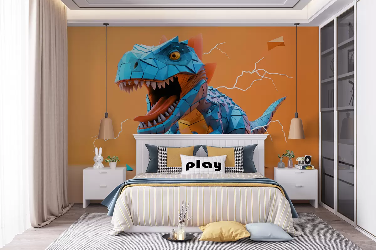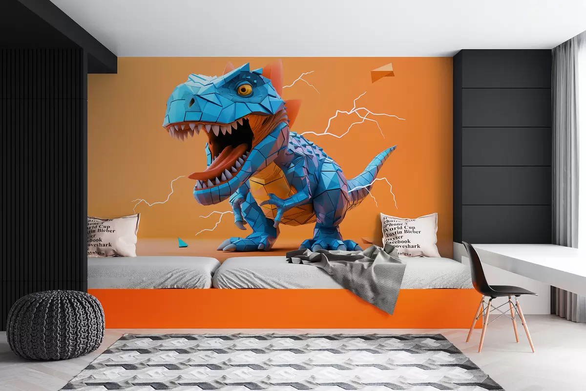 Fotobehang Woeste dinosaurus met blikseminslag in gele en blauwe kleuren N° w01333v1