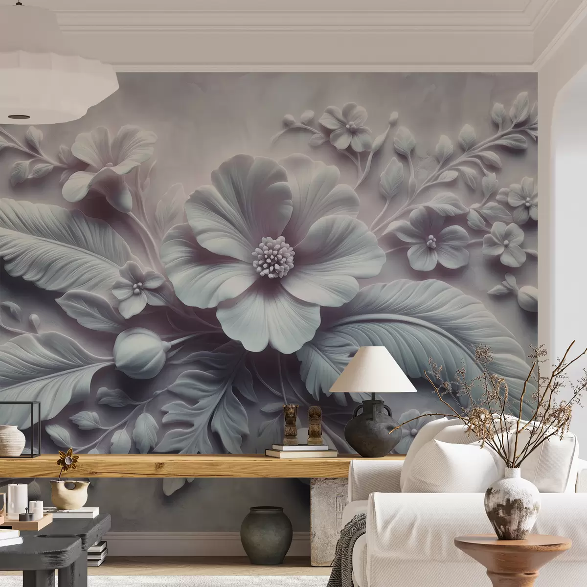 Fotobehang 3D reliëf wandkunst met veren en bloemen, met een grote klaproos in lichtblauwe kleuren N° w01340v2