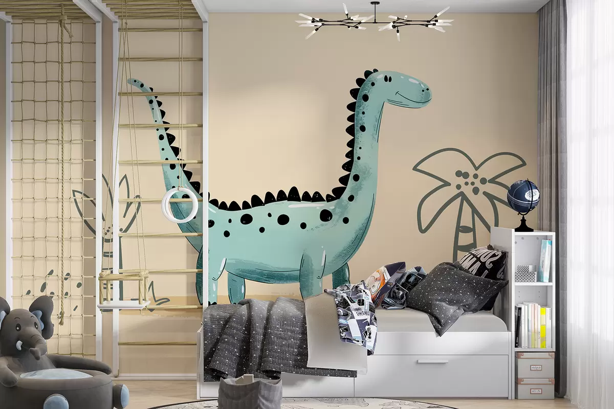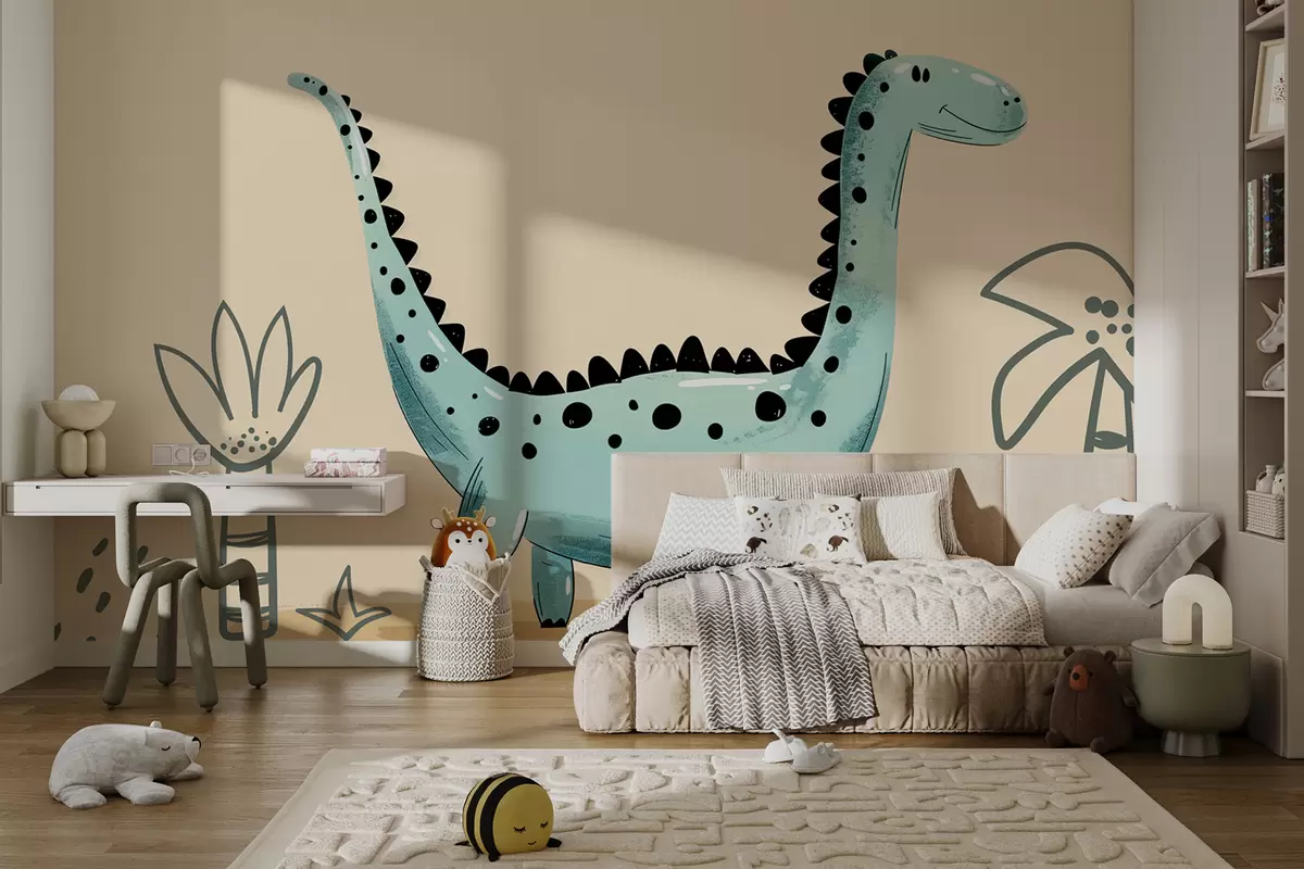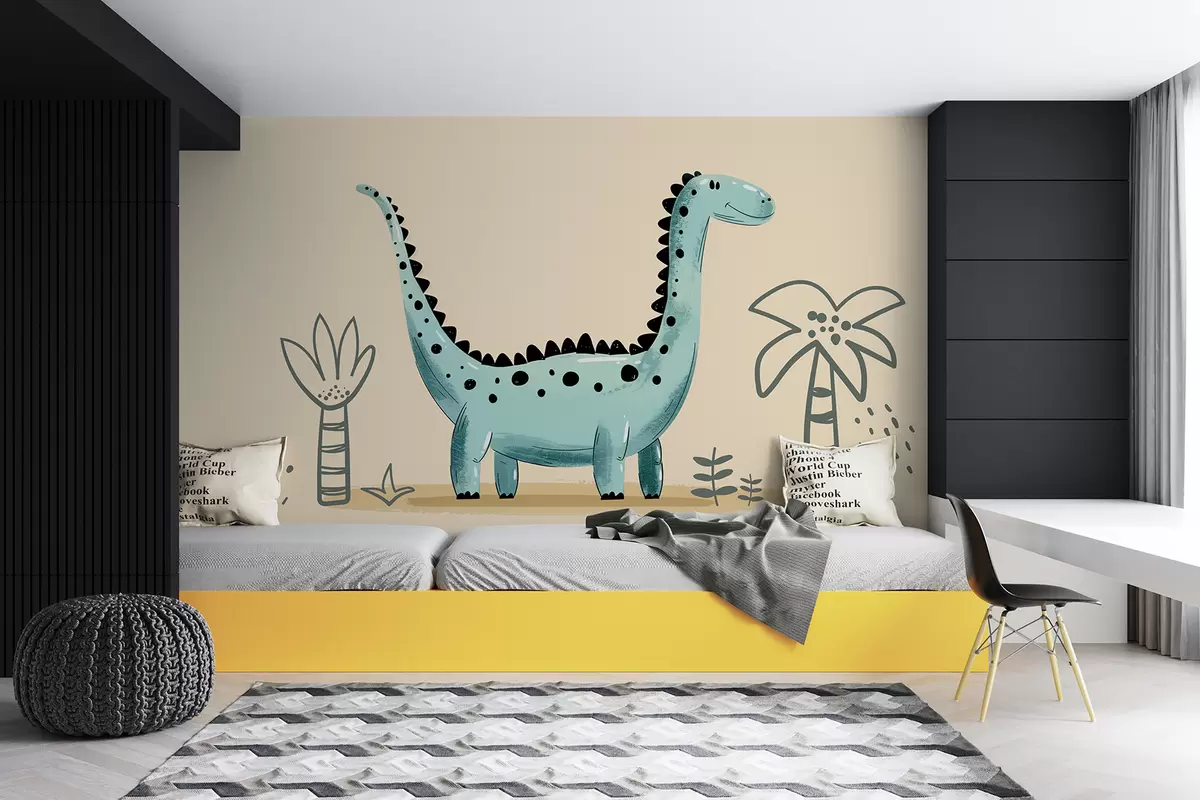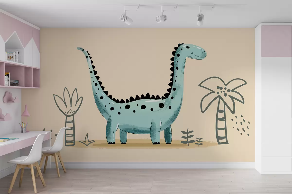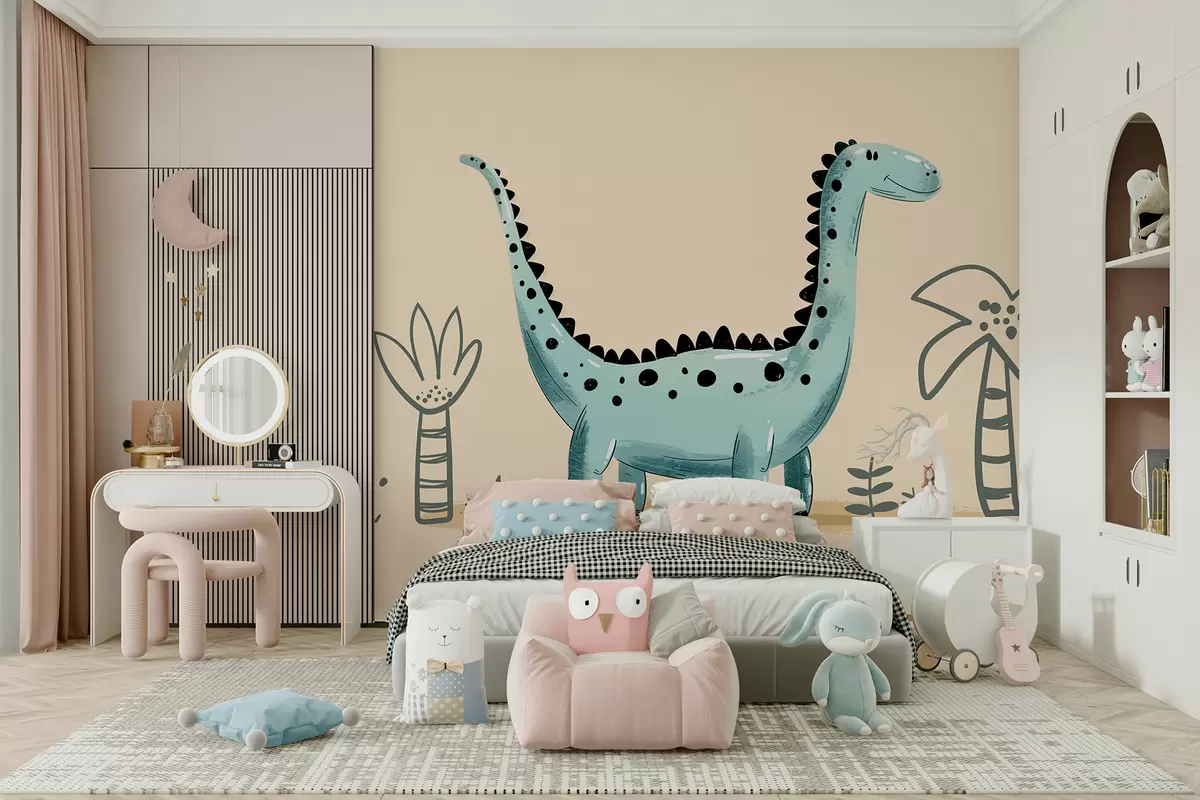 Fotobehang Schattige dinosaurus op een beige achtergrond met palmbomen N° w01357v1
