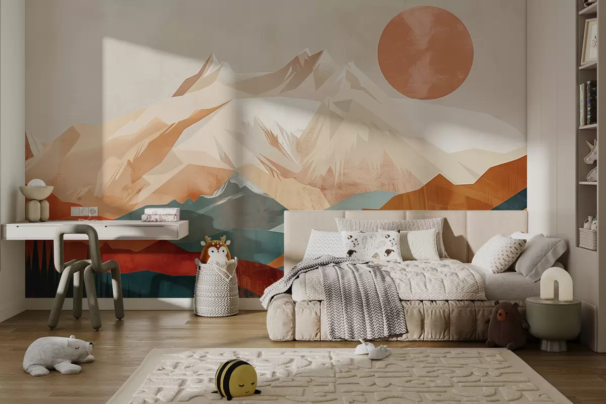 Fotobehang Boho-gelukzaligheid: een sereen landschap van bergen, bomen en zon N° w01358