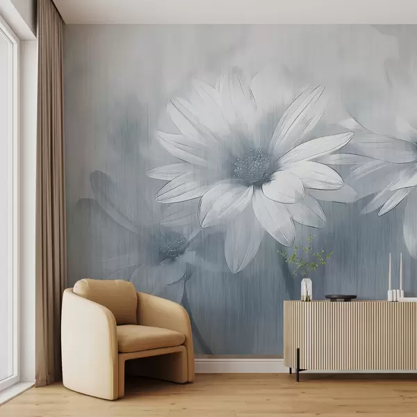 Fotobehang grote bloemen op een getextureerde muur in blauwe kleur N° w01374v1