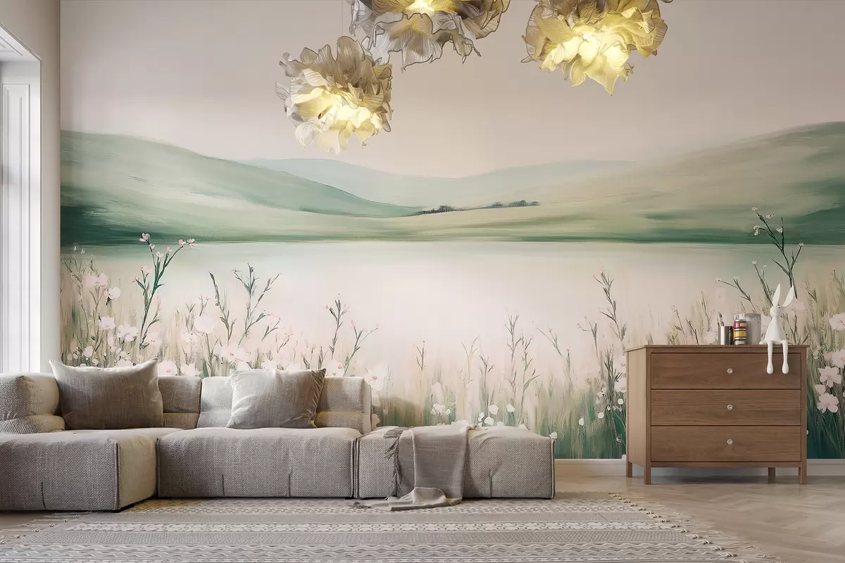 Fotobehang Bloemenweide, natuurlandschap, meer, roze bloemen, groene heuvels N° w01387