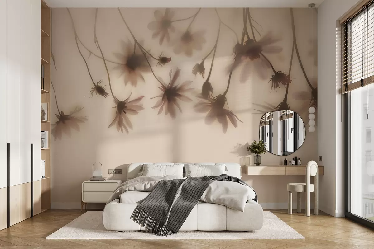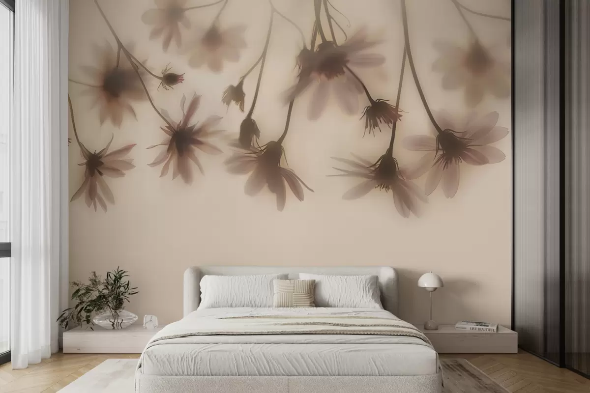 Fotobehang Tedere bloemen in de mist hangend van boven in roze kleuren N° w01469
