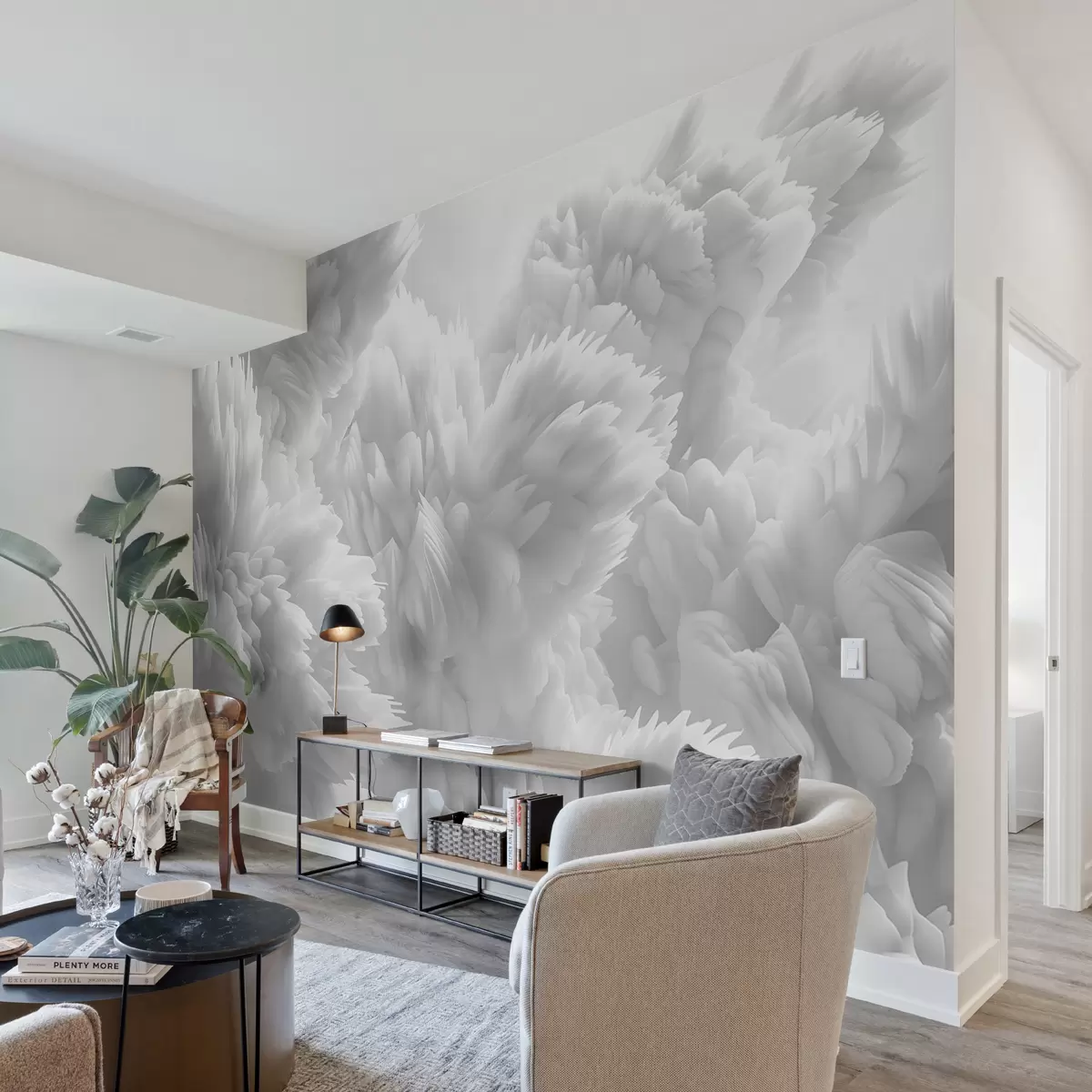Fotobehang Abstracte compositie van sneeuwkristallen in een gelaagd verenpatroon in een etherische atmosfeer N° w01474