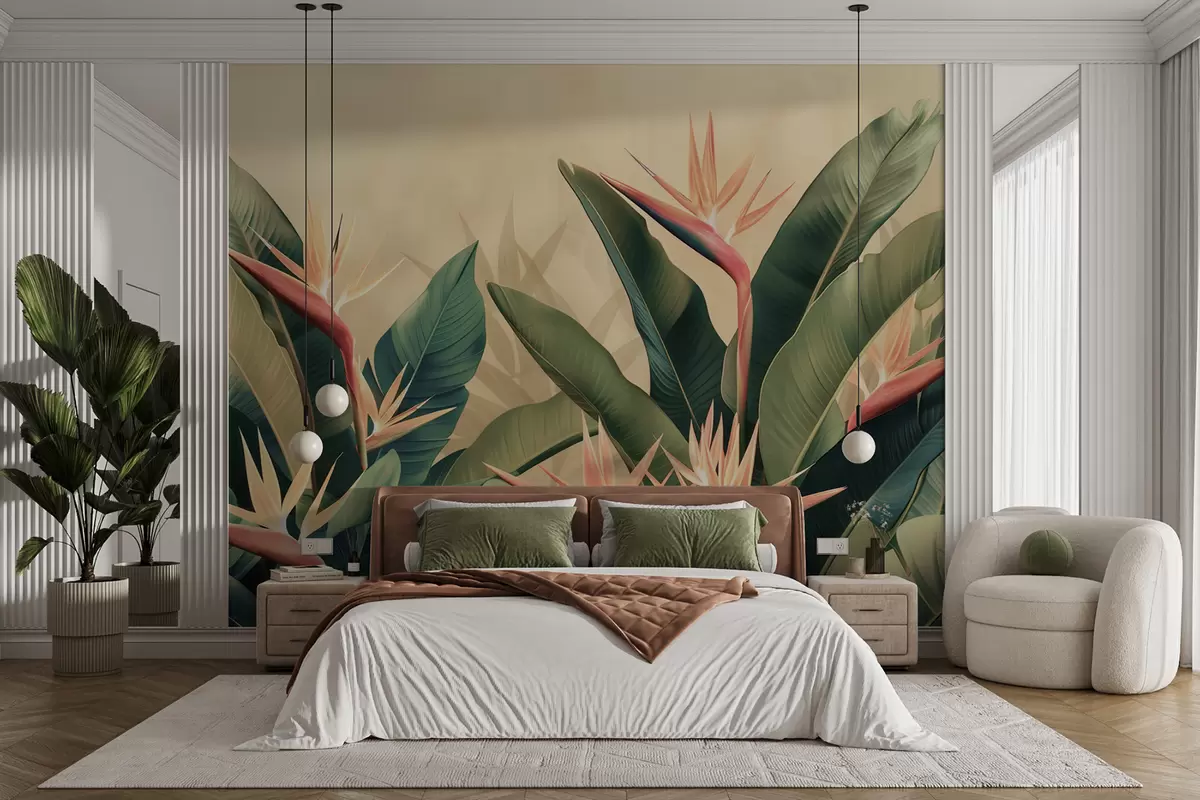 Fotobehang Weelderige opstelling van tropische bloemen omgeven door grote donkergroene bladeren N° w01484v1