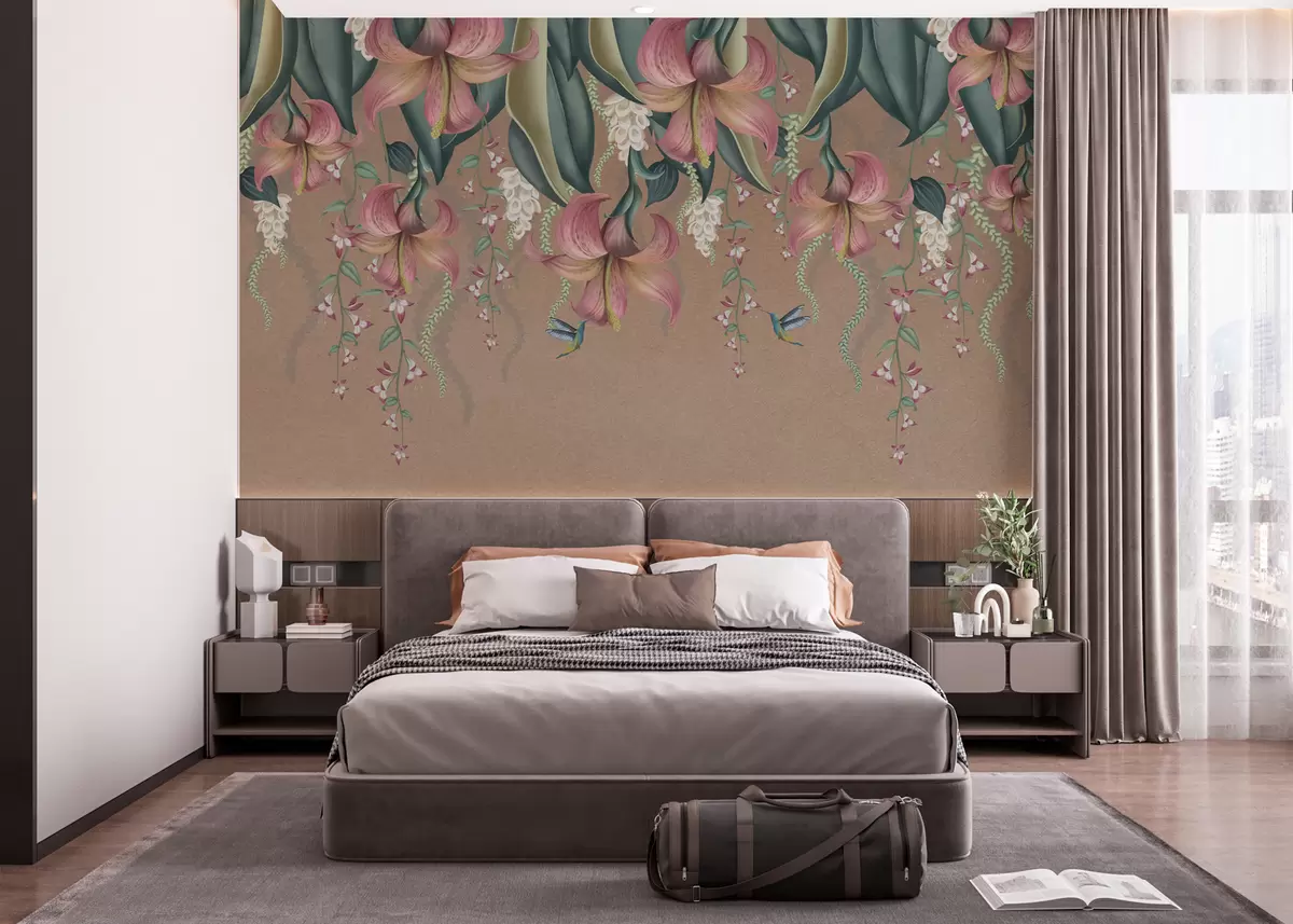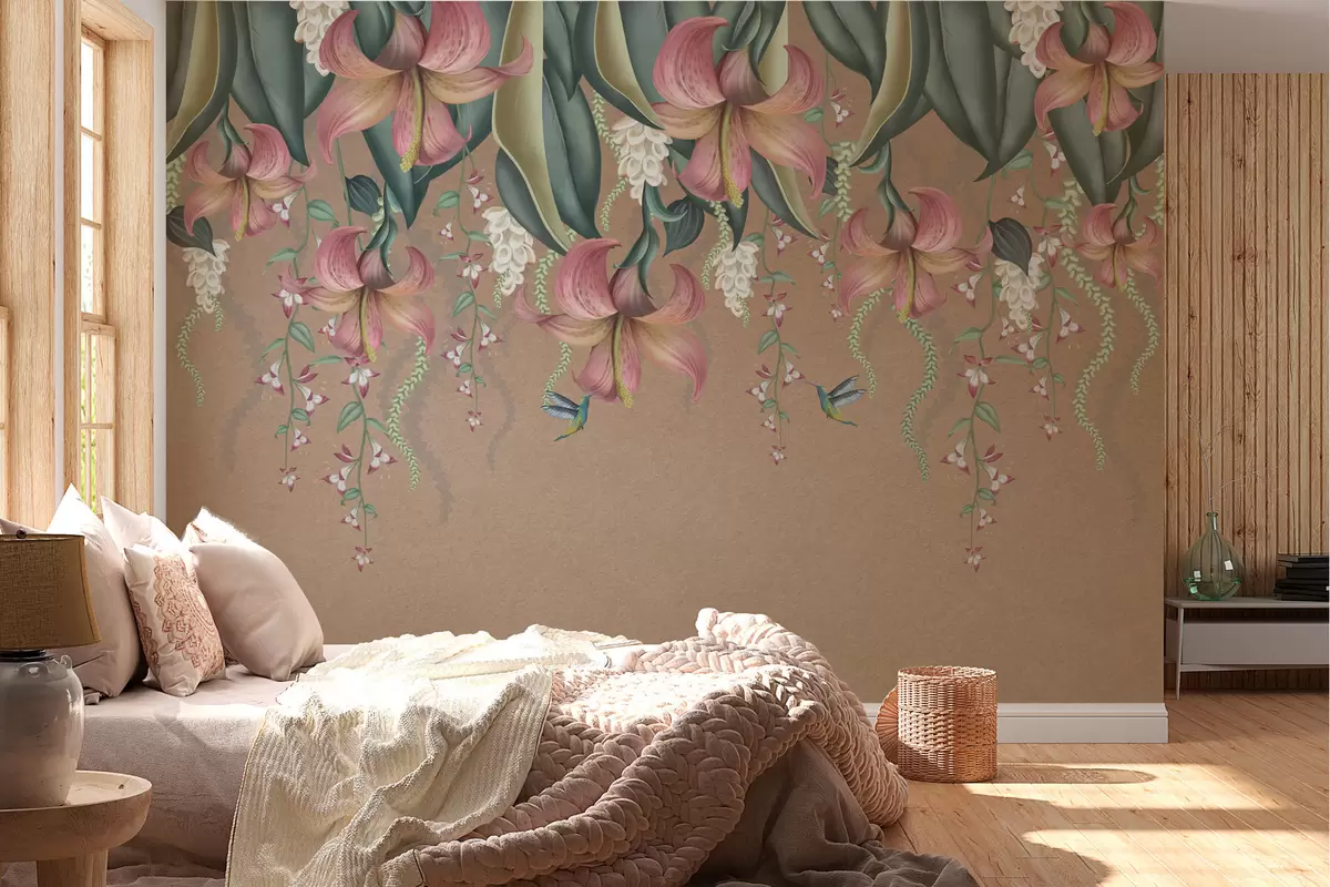 Fotobehang Delicaat botanisch motief met hangende lelies, bloemen en kolibries op een grunge muur N° w01523