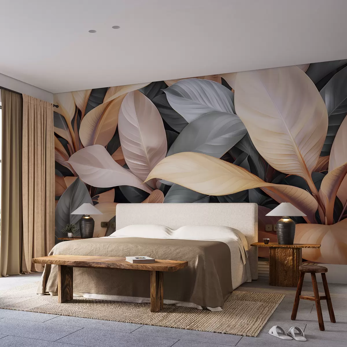 Fotobehang Grote tropische bladeren in blauw en beige N° w01587v2