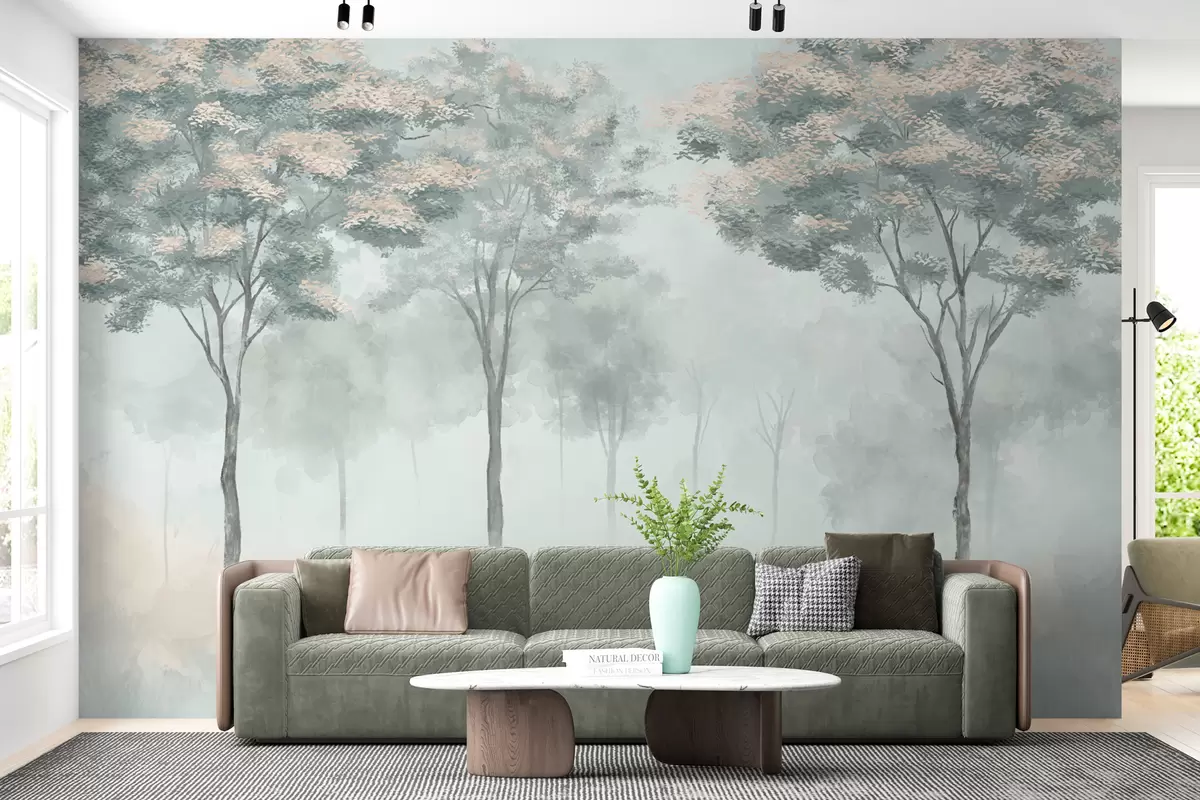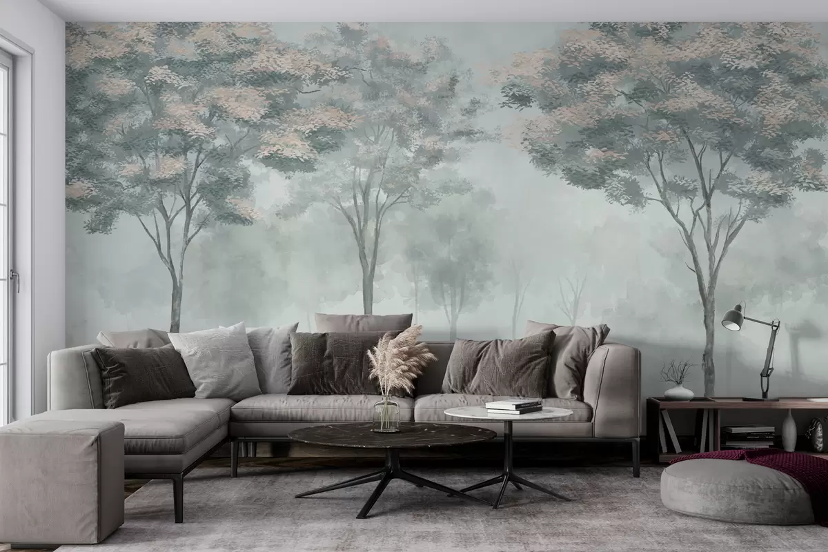 Fotobehang Mistig bos silhouet in groen, lichtgrijs en beige kleuren N° w01599
