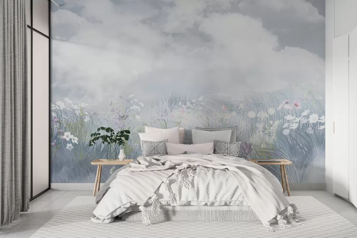 Fotobehang Wilde bloemen en grassen met balkanhemel en wolken N° w01624